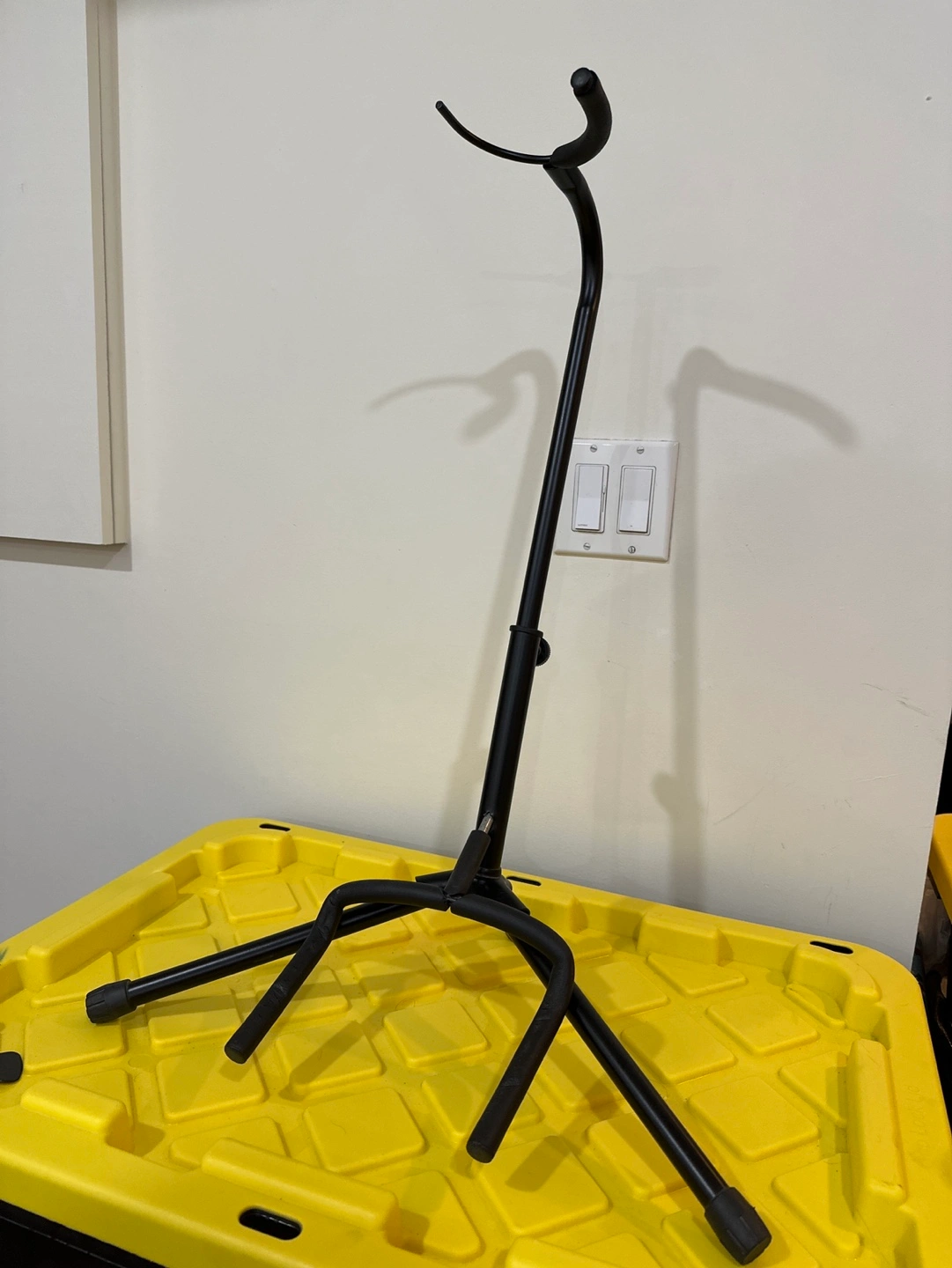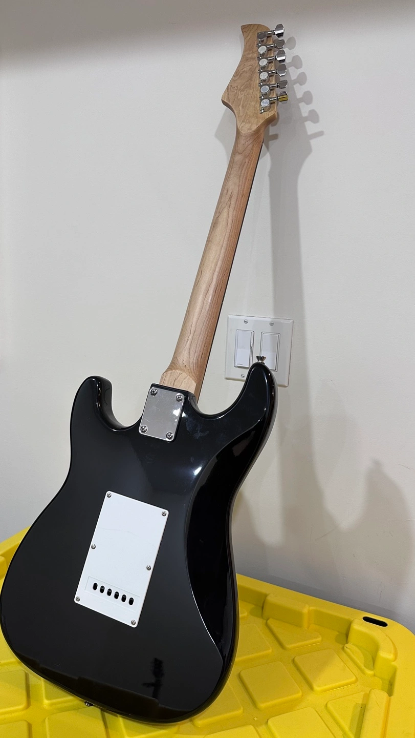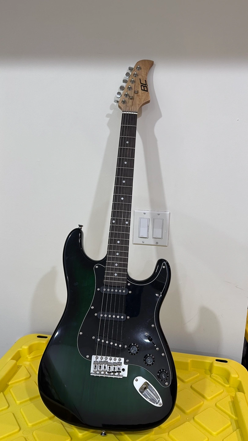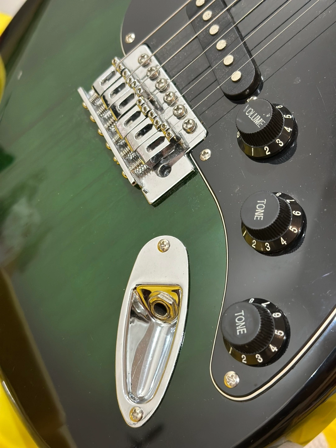 Black electric guitar with green burst finish. Includes a tremolo bar, 3 knobs and 5-way selector switch
