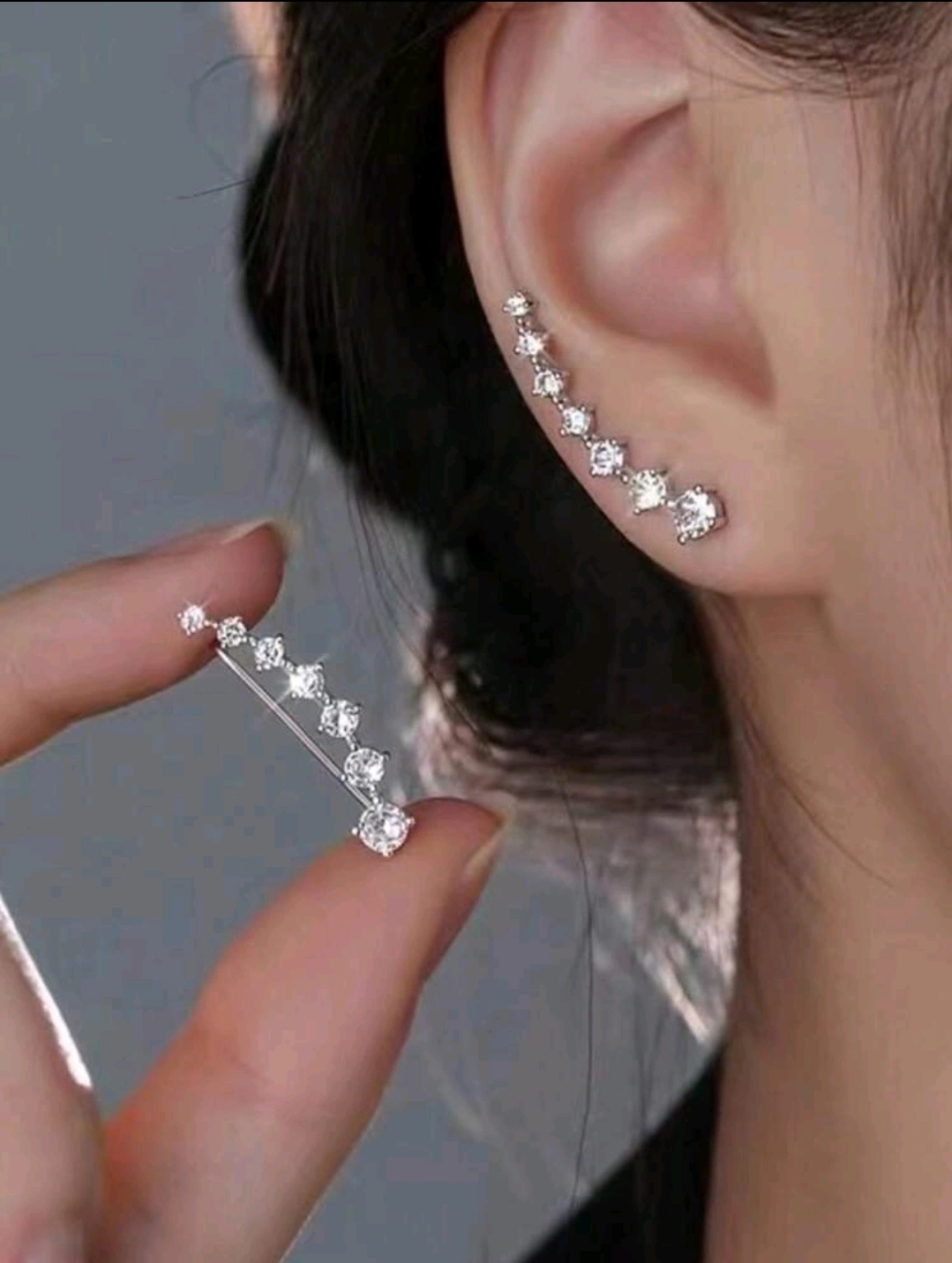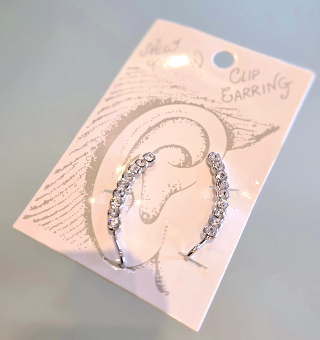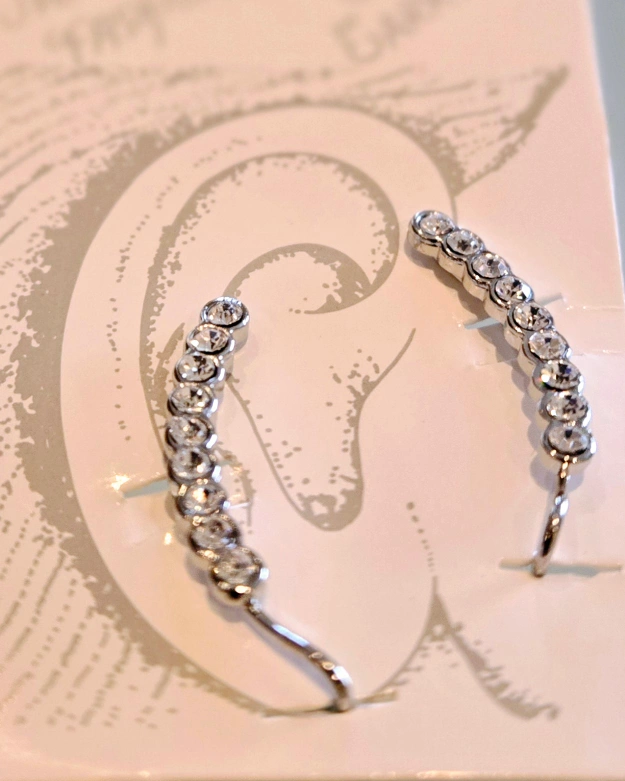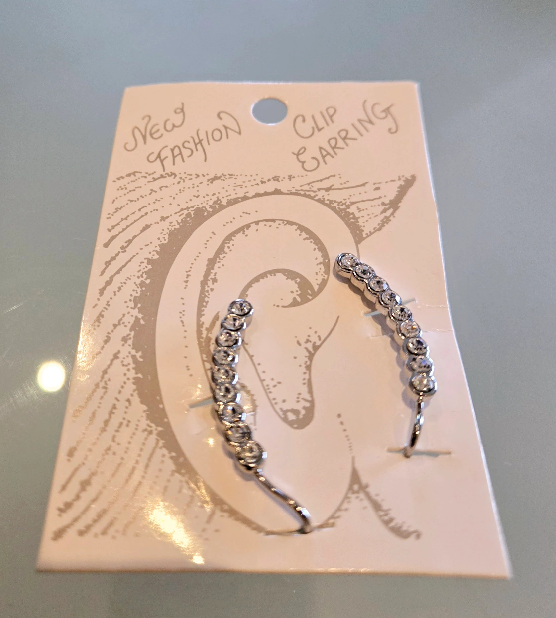 Silver ear cuffs with clear crystals. Clip on style. Never worn, in original package.