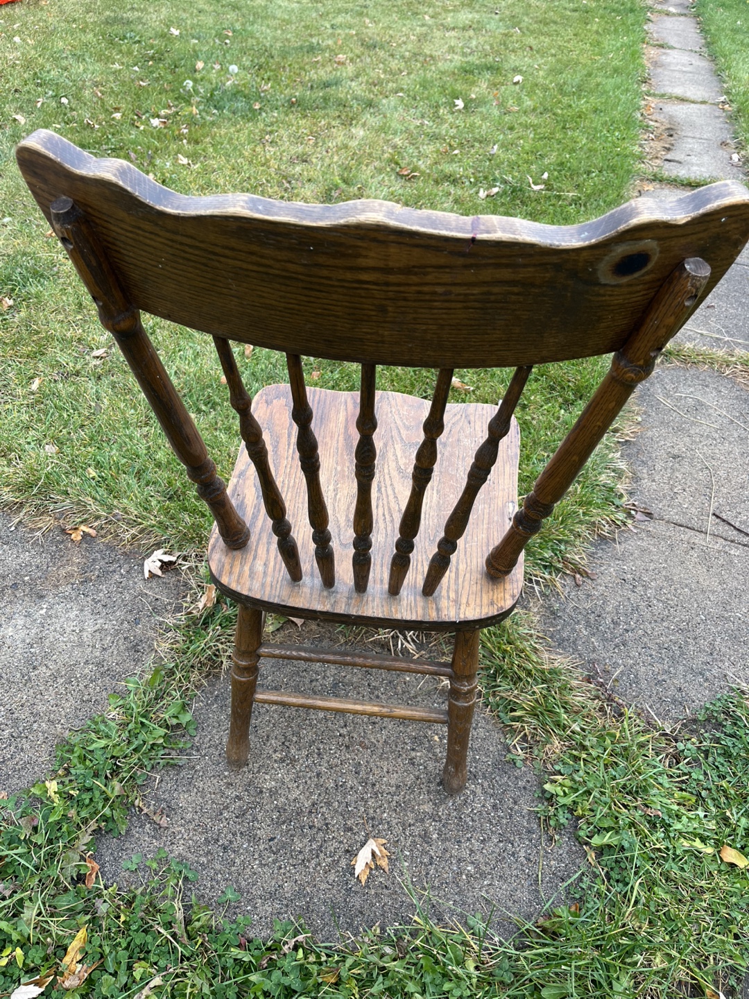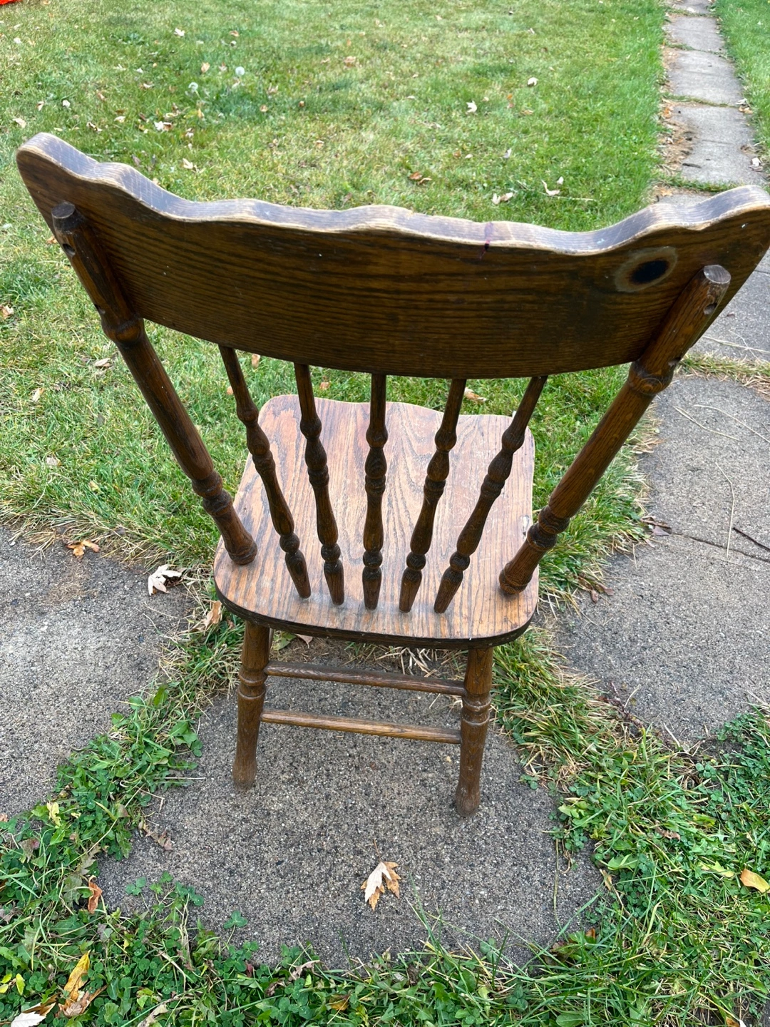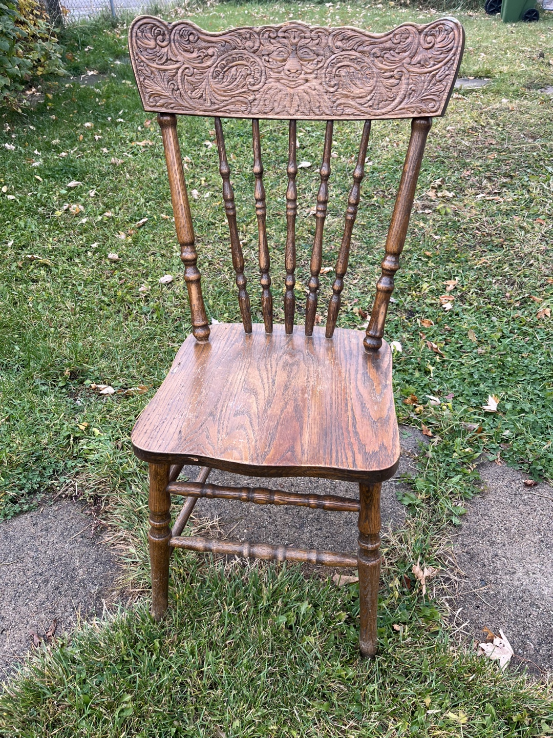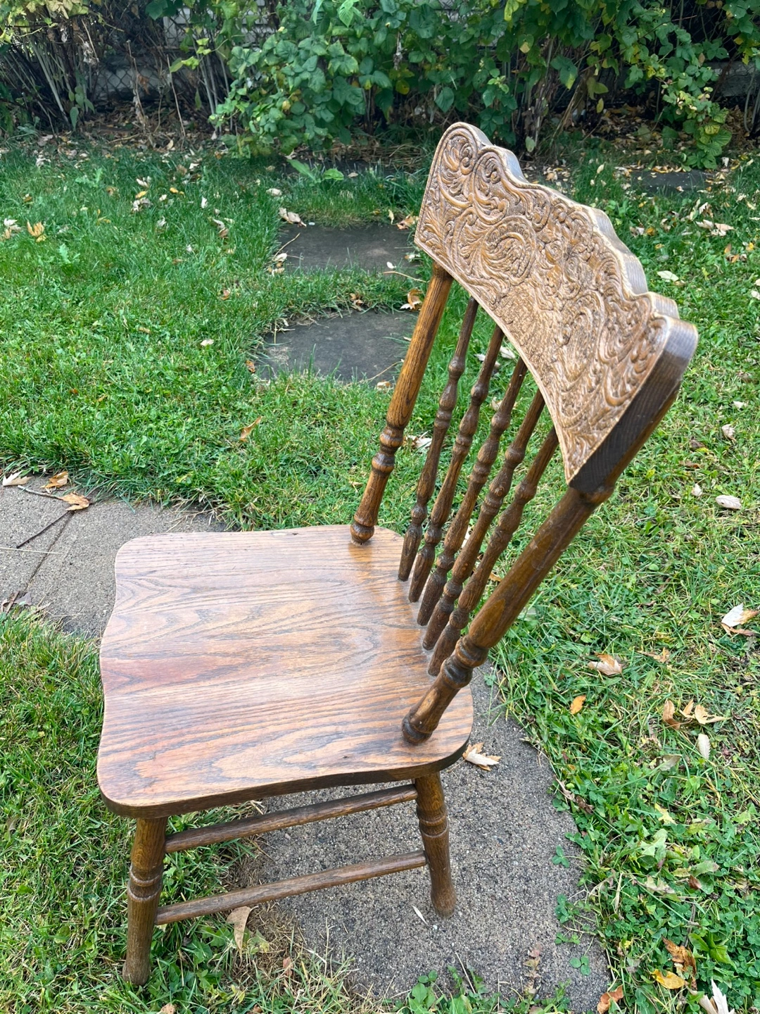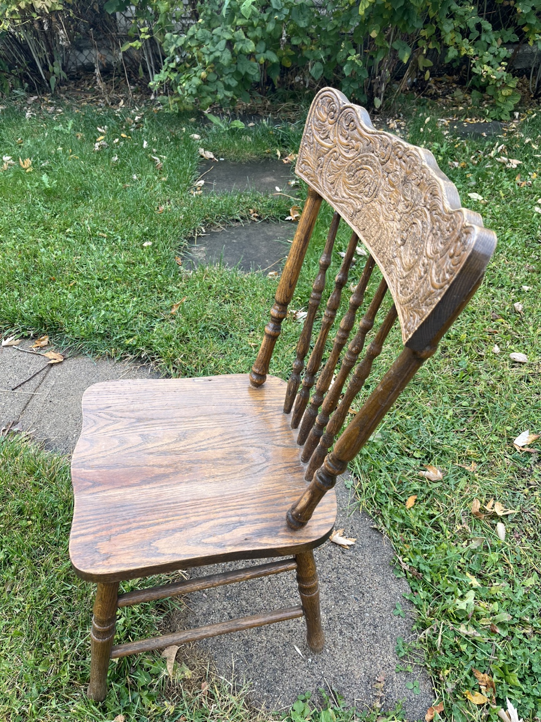 Wooden chair with intricate carvings on the back. The chair has a wooden seat and is in used condition. It is solid and sturdy and would be a great addition to any home.