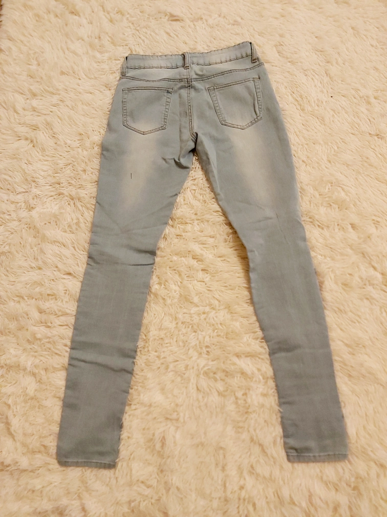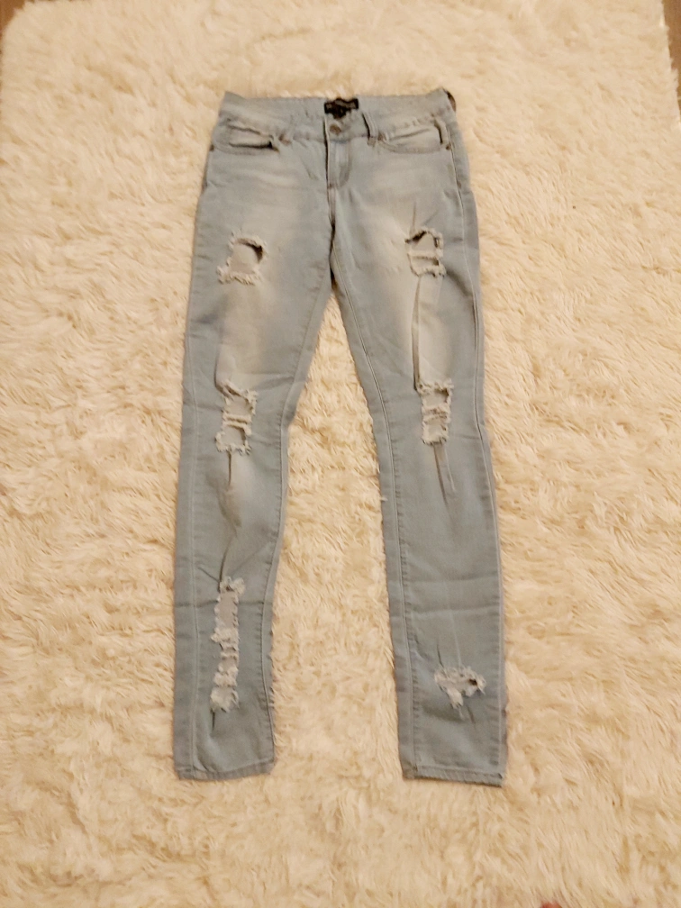 Light wash distressed skinny jeans with multiple rips and tears. barely worn, loonnggg time ago. everything is washed and ready to go. worn or not.