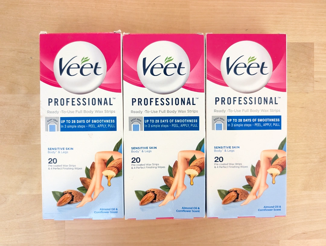 Three boxes of Veet Professional body wax strips. 20 strips per box. Almond oil and cornflower scent. Sensitive skin. Ready-to-use full body wax strips. Up to 28 days of smoothness.