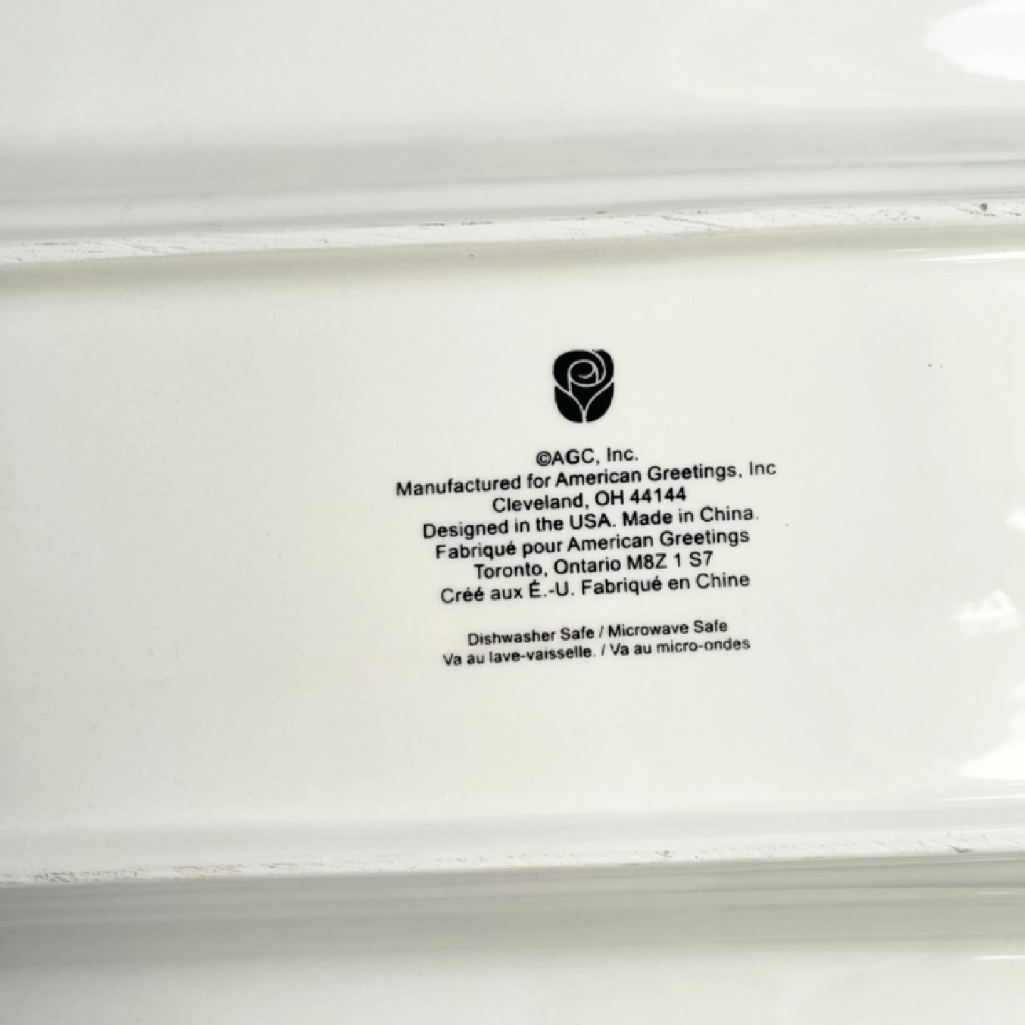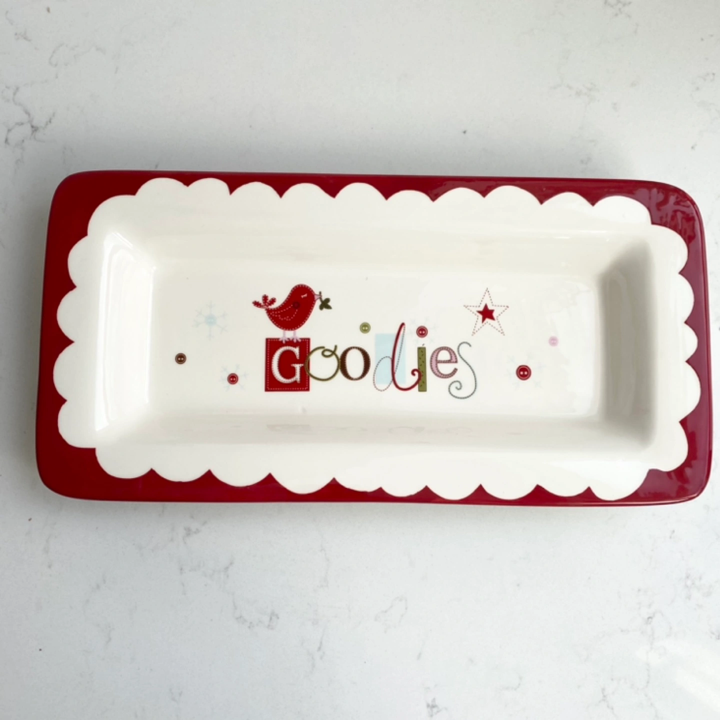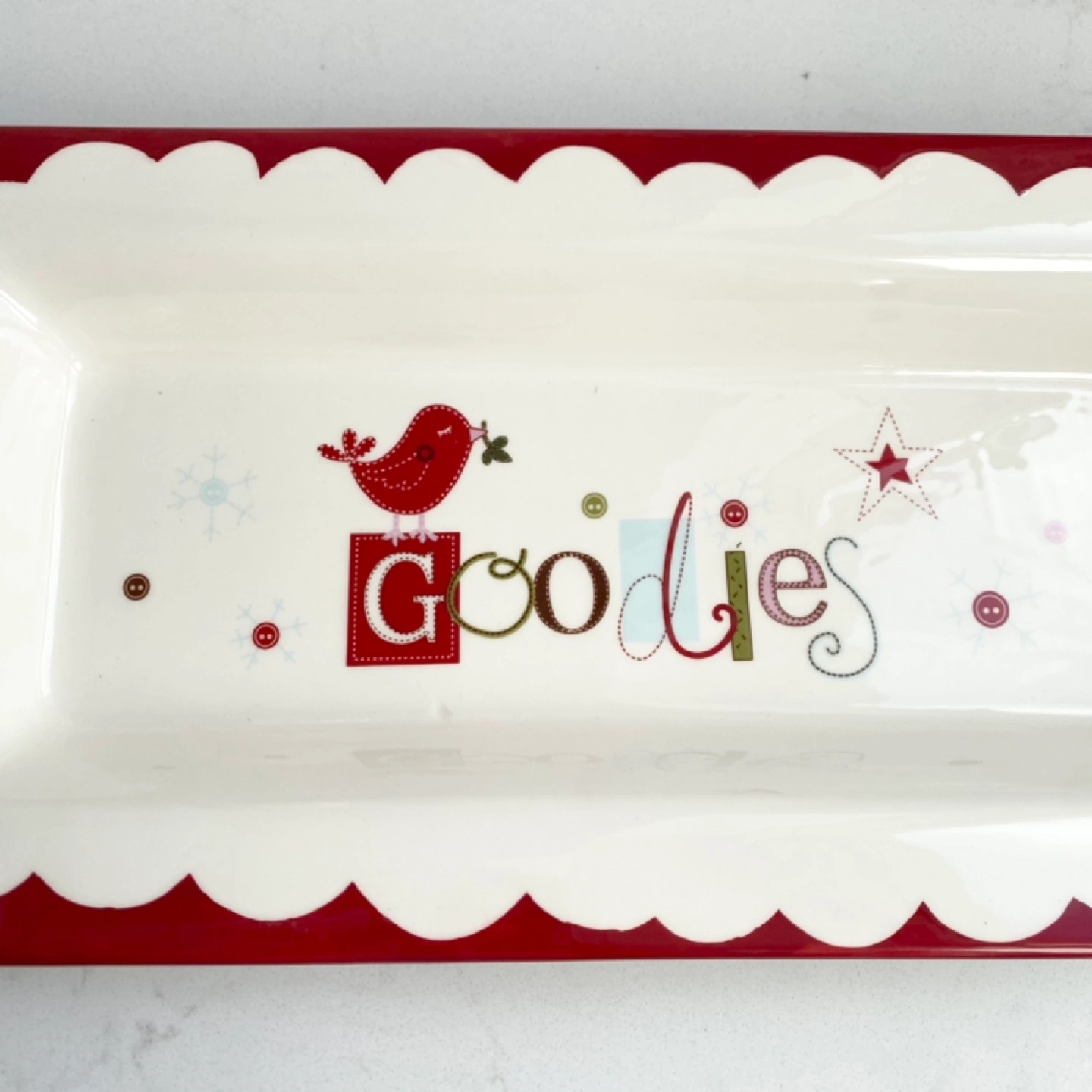 White ceramic platter with red trim and a scalloped edge. Features a red bird and the word 'Goodies' in colourful font. Dishwasher and microwave safe.
