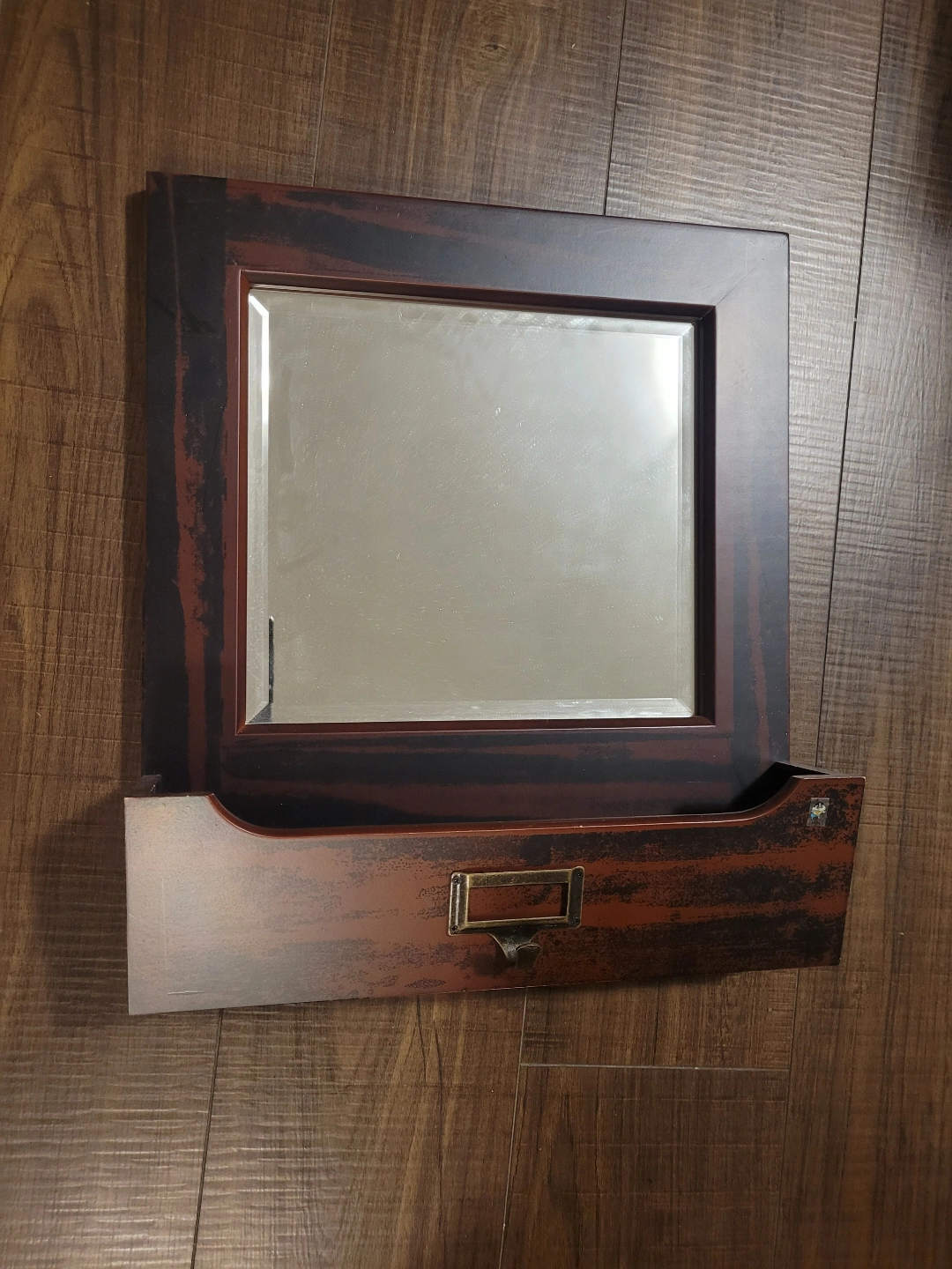 Wall mounted mirror with a small shelf to put keys or other items in. There's also a small hook to hang keys or other items. Features a rustic finish.