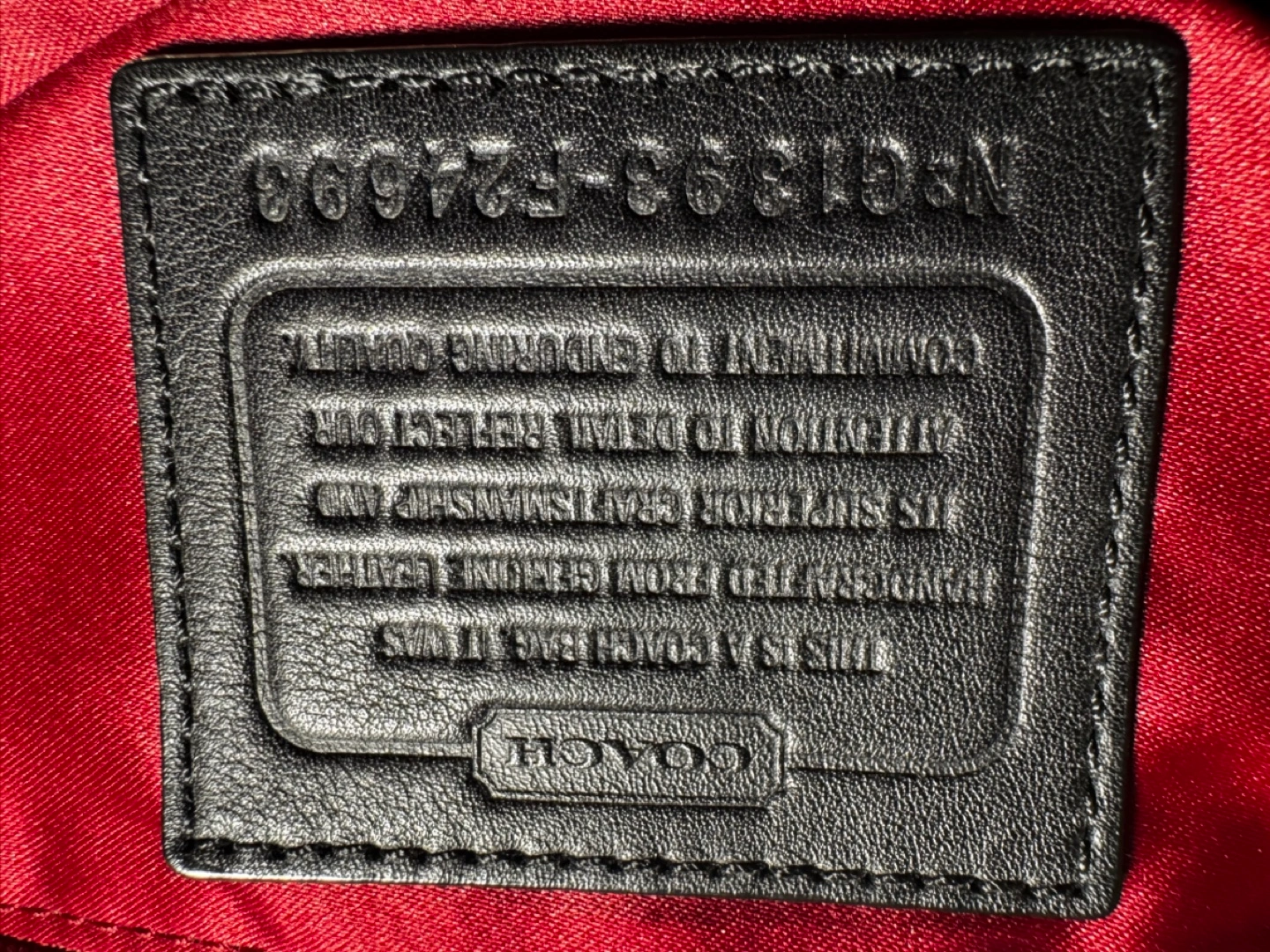 Black leather tote bag with red quilted detail. Has a small pocket on the front and a zipper closure. Has a red lining.
