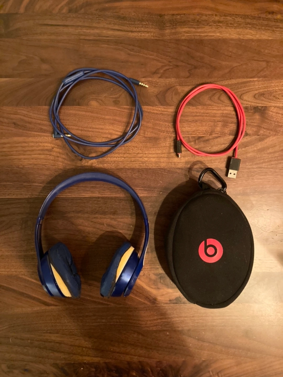 Blue on ear headphones with a carrying case and charging cable. Wireless but has cord to use a wired.