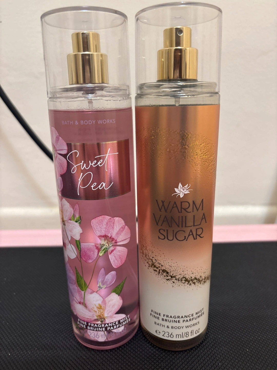 192Two new bottles of Bath & Body Works fine fragrance mist, one in the scent Sweet Pea and one in the scent Warm Vanilla Sugar. Each bottle contains 236ml/8 fl oz.