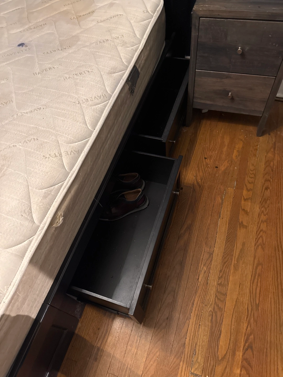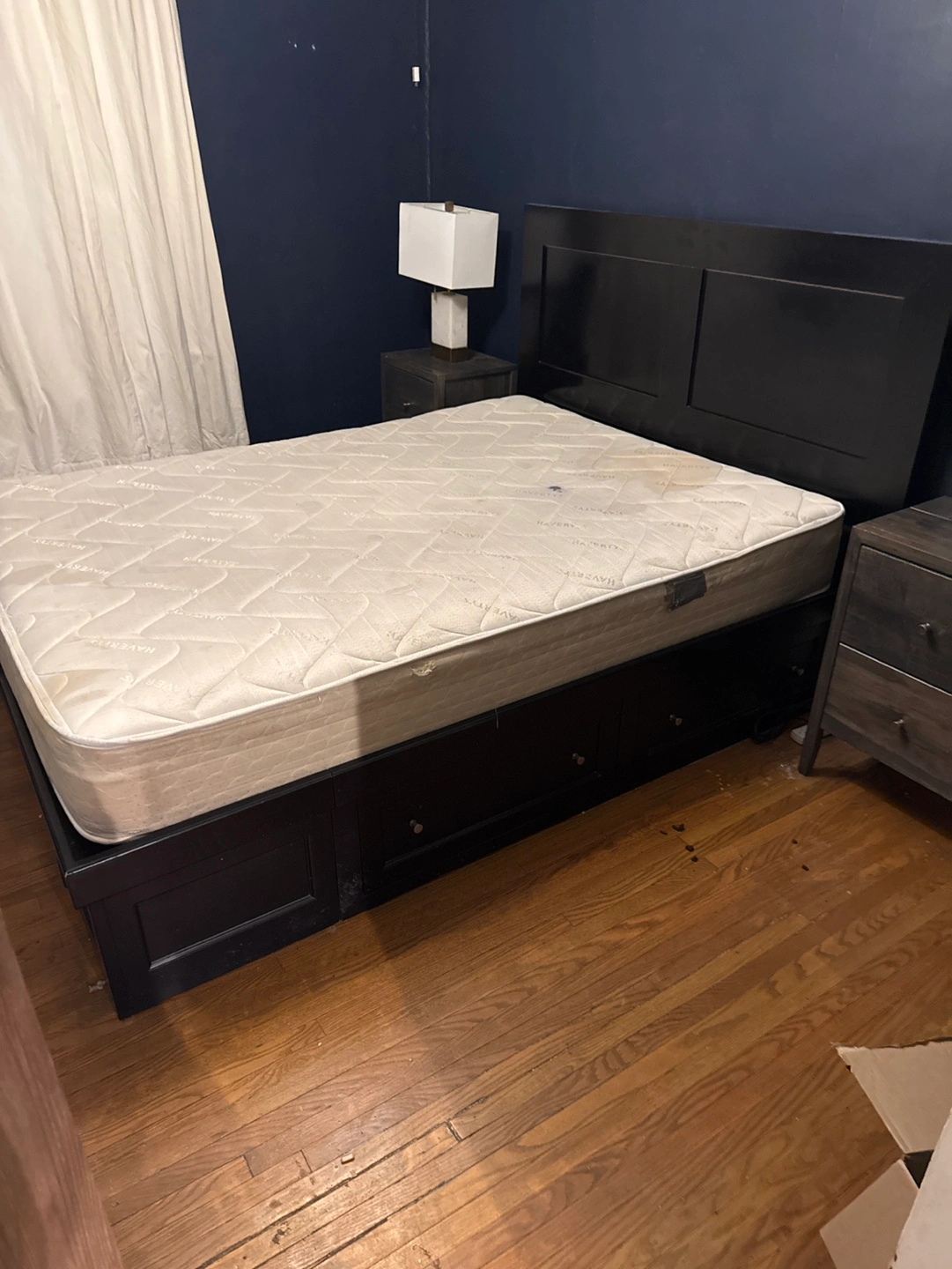 175Queen-sized platform bed frame made by Mennonites in solid maple with headboard and storage drawers. Dark brown finish.