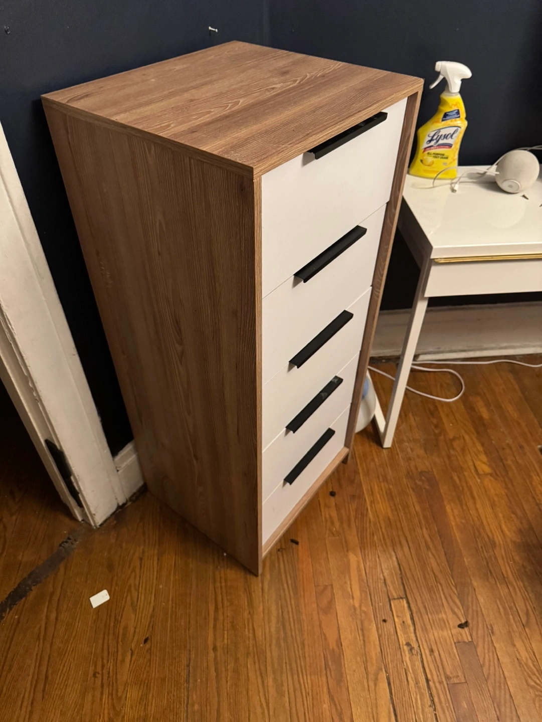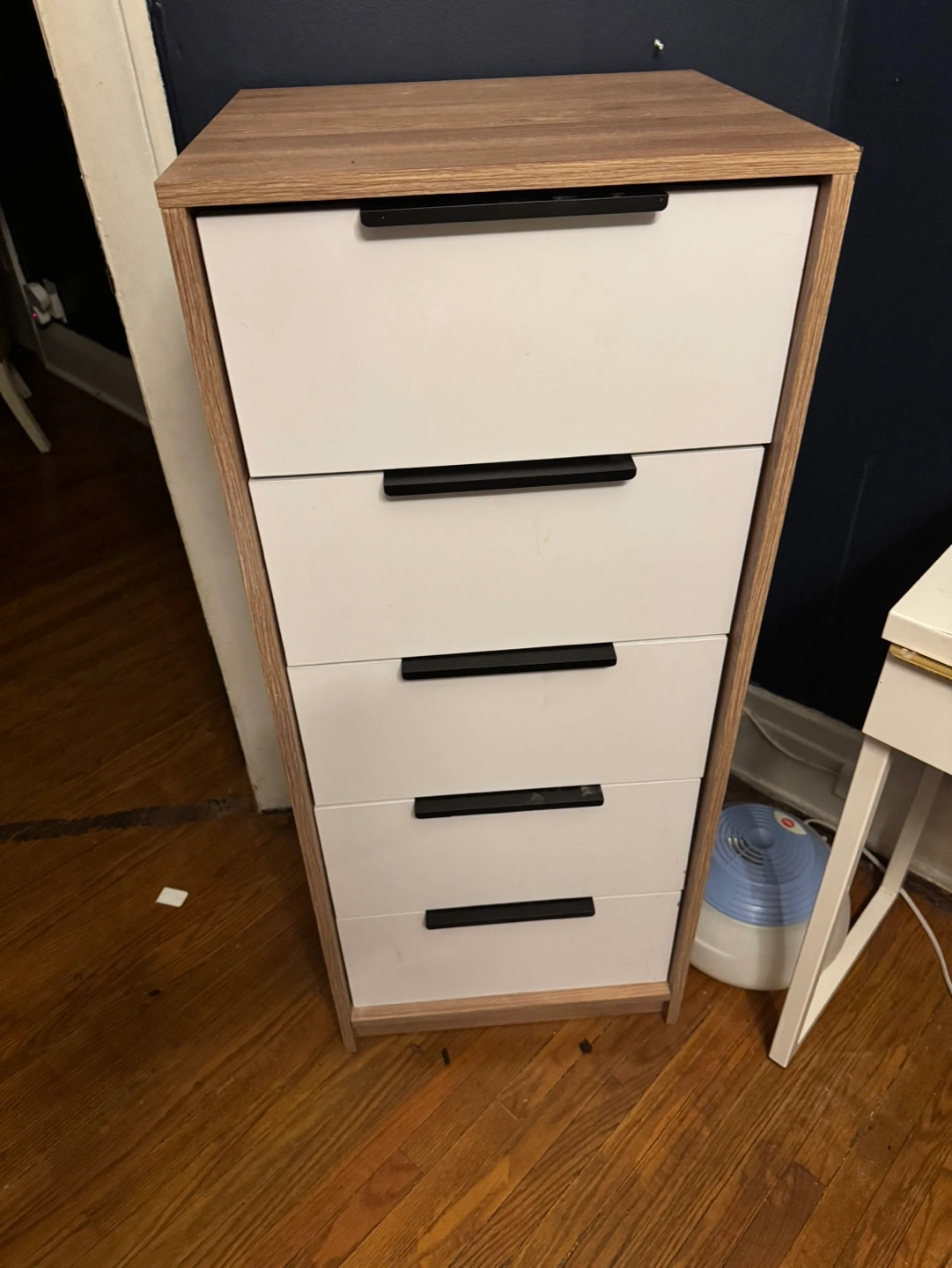 175Tall chest of drawers with 5 drawers. White drawers with black handles. Wood top.