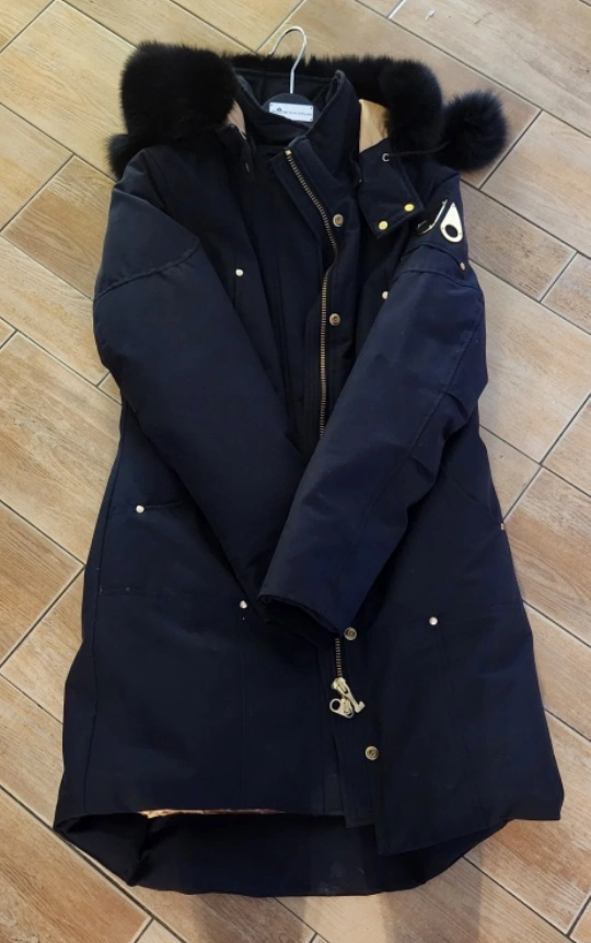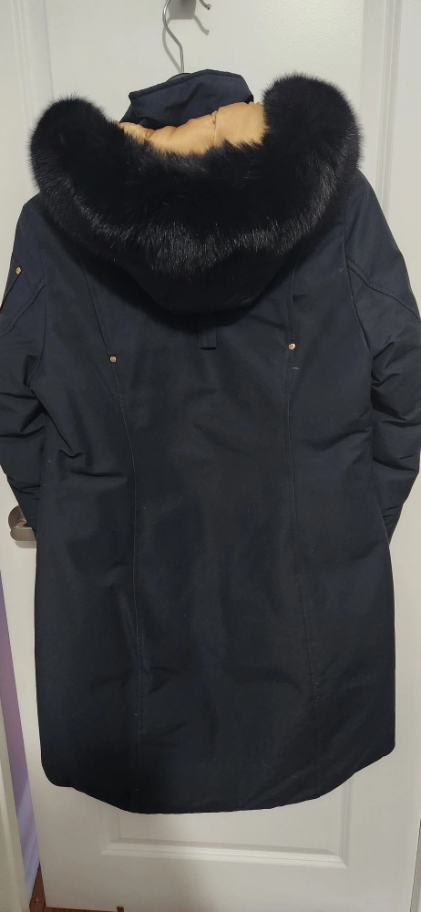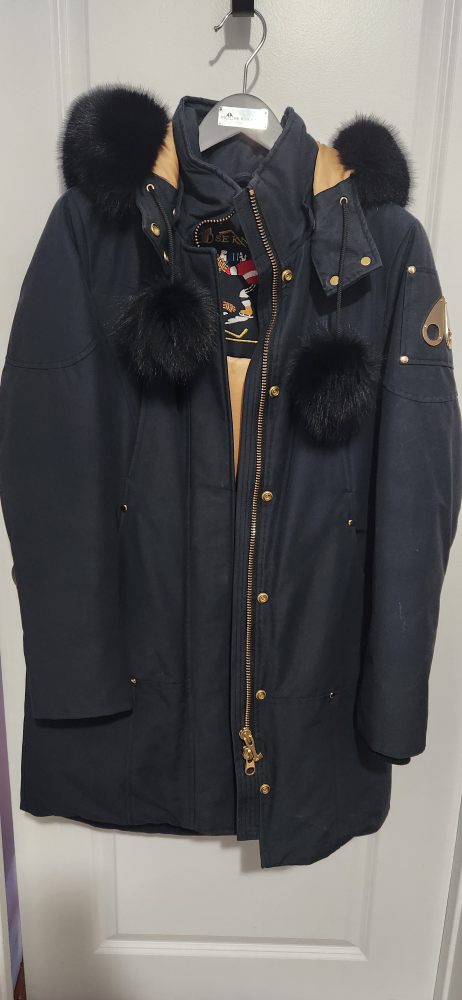 Be ready for winter in this stylish authentic Black down moose knuckle parka with fur hood. Gold hardware. Size Medium. Comes with a garment bag. Only worn a few times!