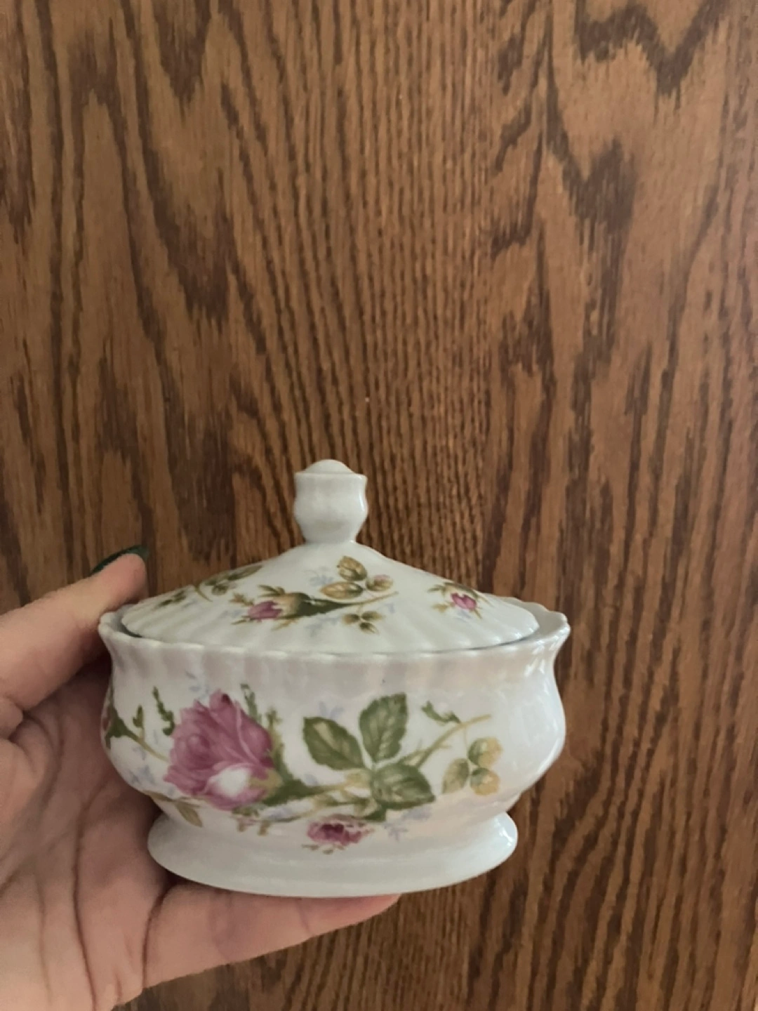 Set of three vintage porcelain pieces with a rose pattern. All three are different sizes and shapes.