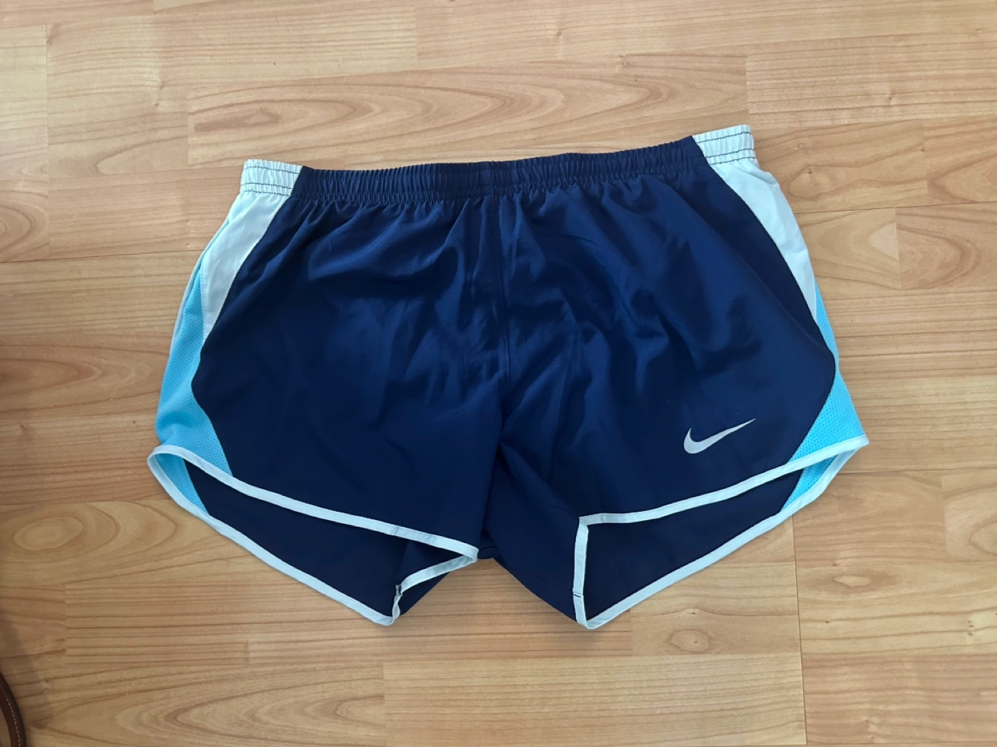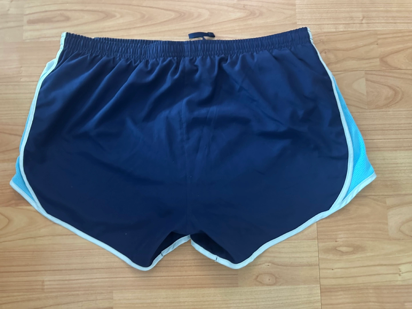 Very good used condition. Women’s Nike size medium. Blue running shorts with white trim. Light blue panels on the sides.