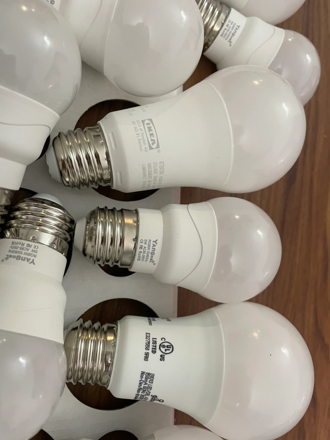 A package of LED light bulbs. Some are IKEA and some are YANGLI. There are 9 in total. $3 each or $15 for all