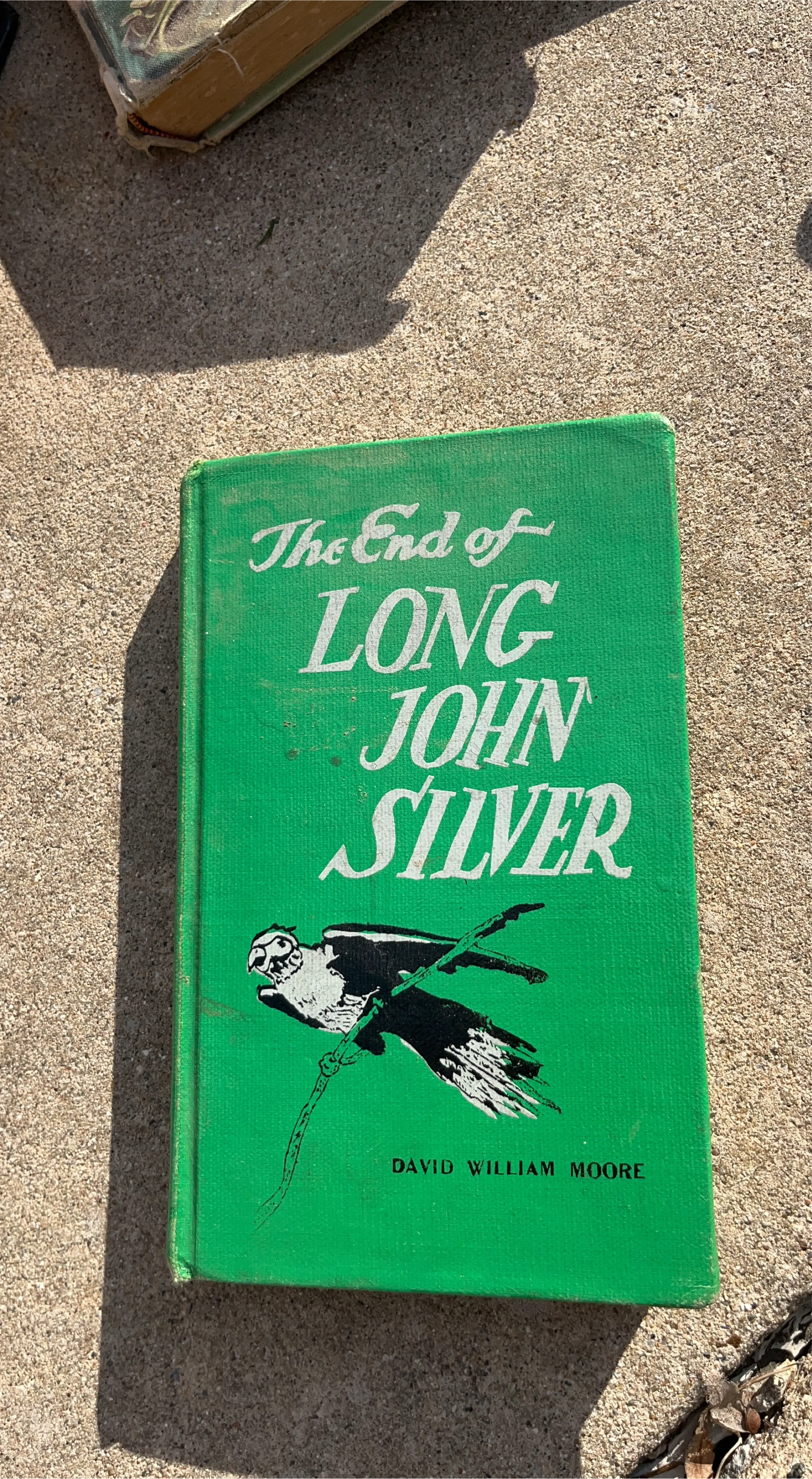 This is a book titled The End of Long John Silver. It's written by David William Moore. The cover is green with a graphic of a bird.