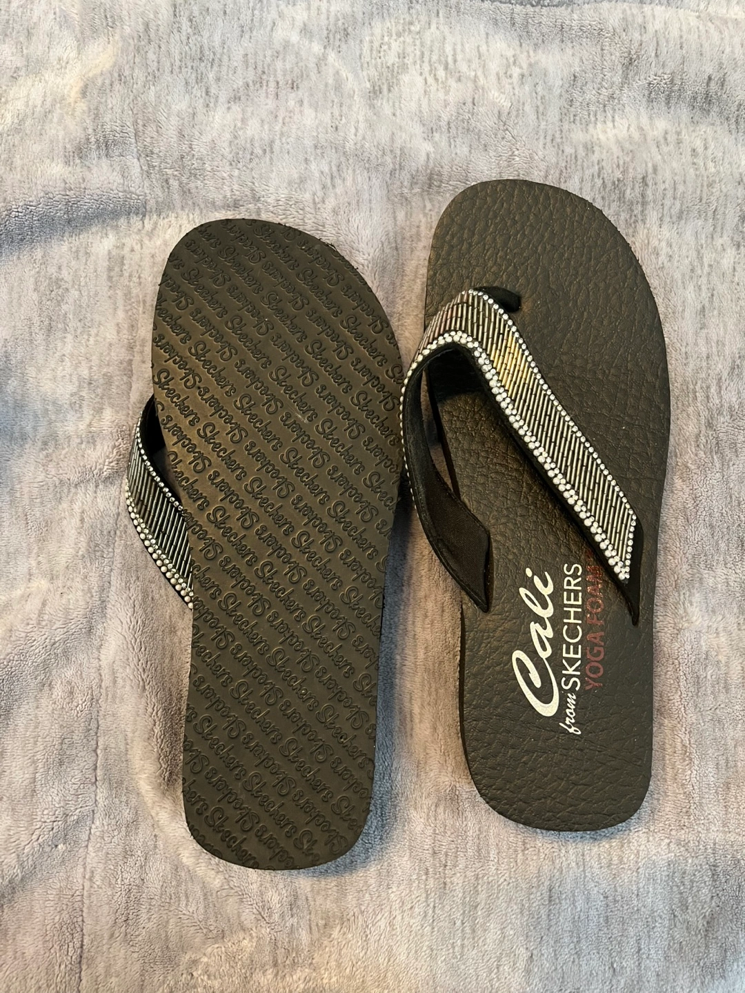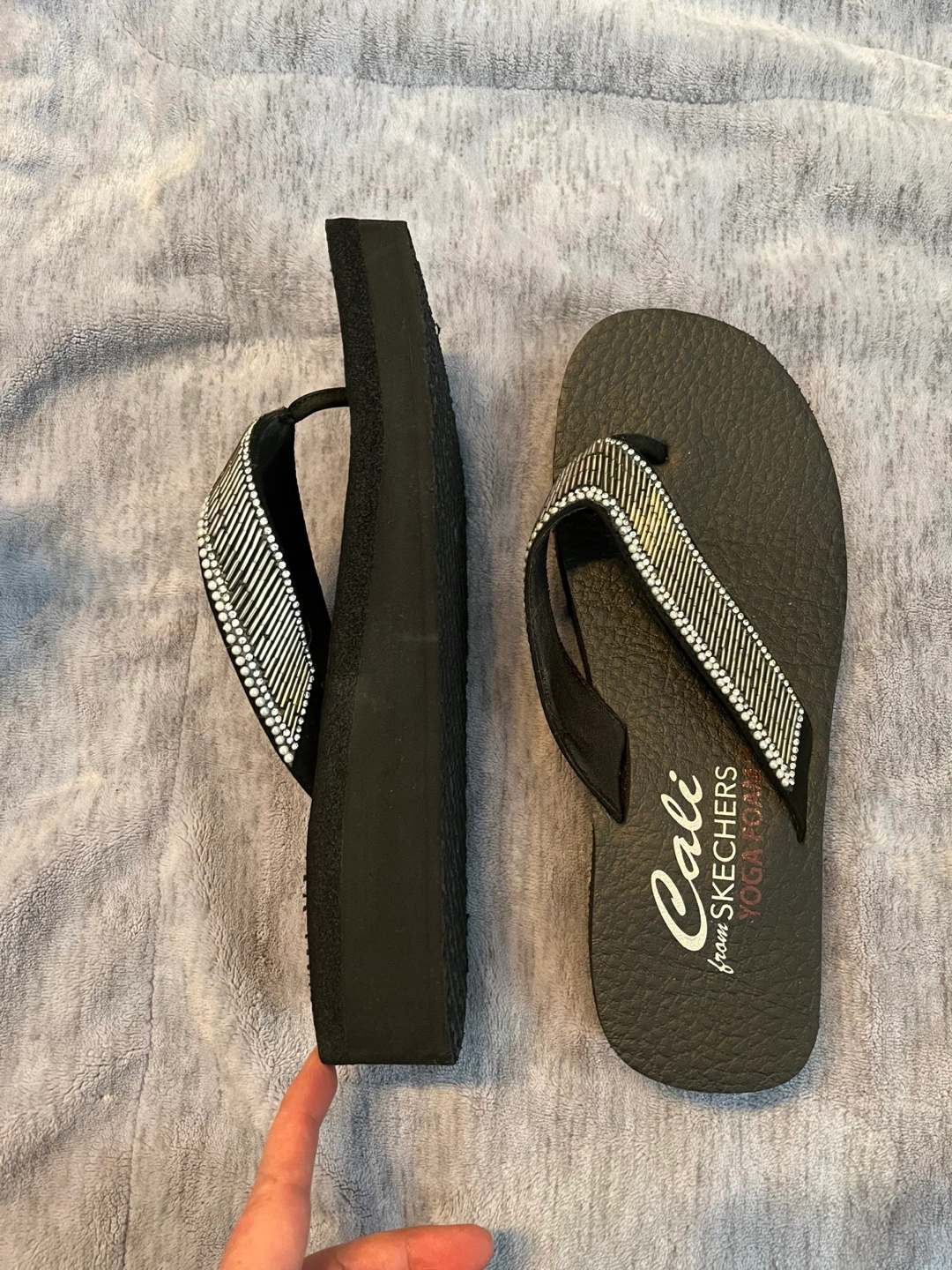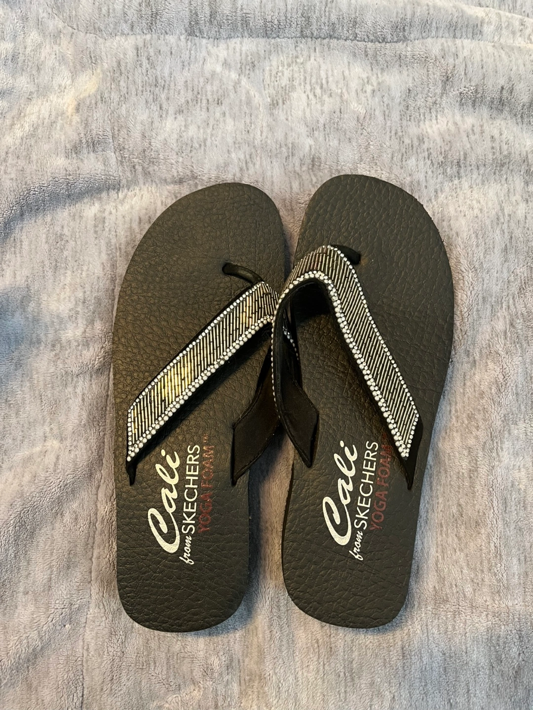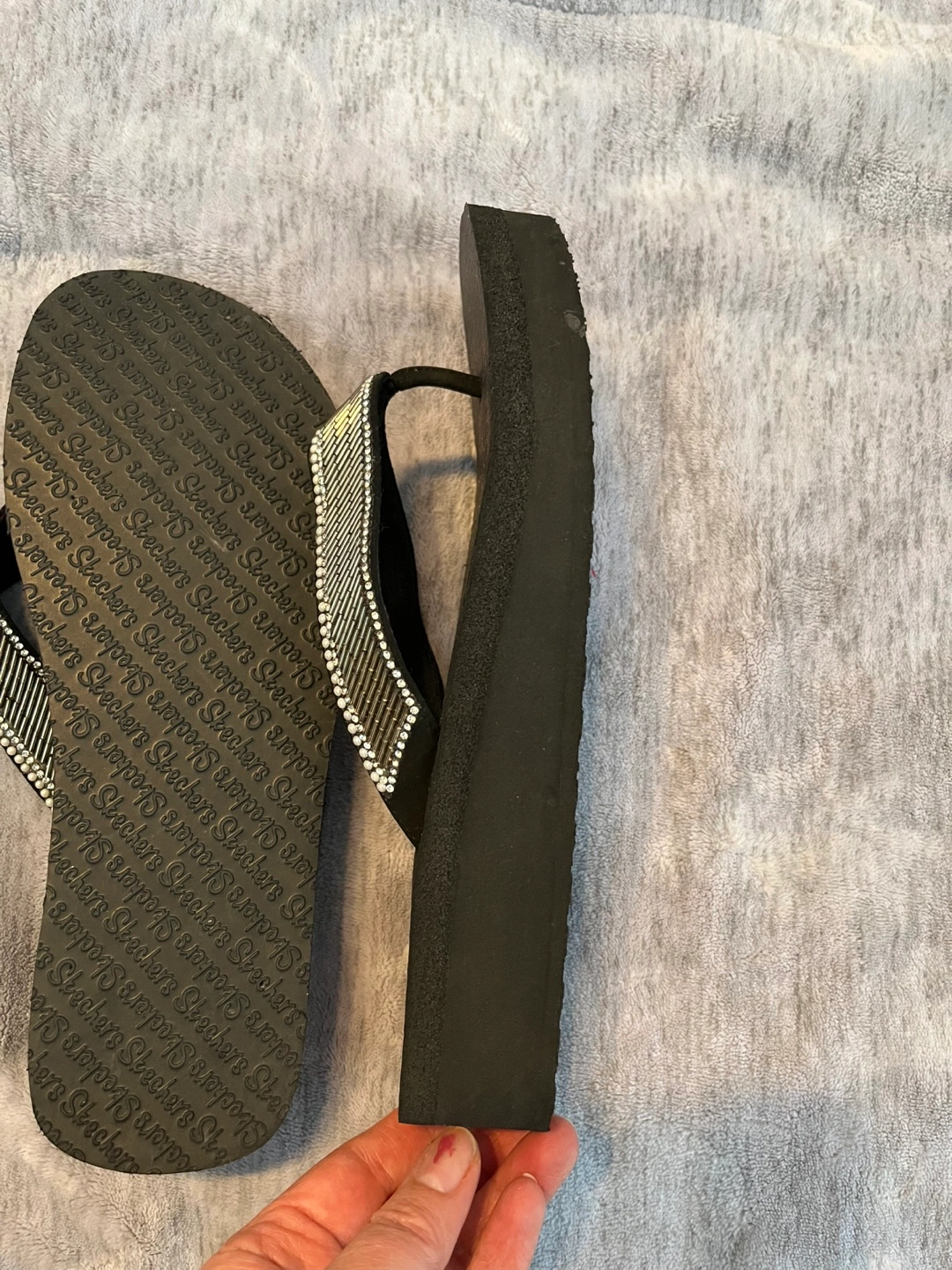 Black flip flops with a thick platform sole and a jeweled strap. From Skechers Yoga Foam collection.