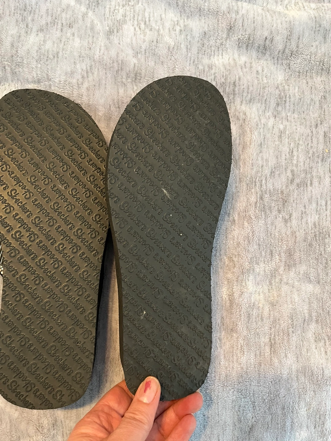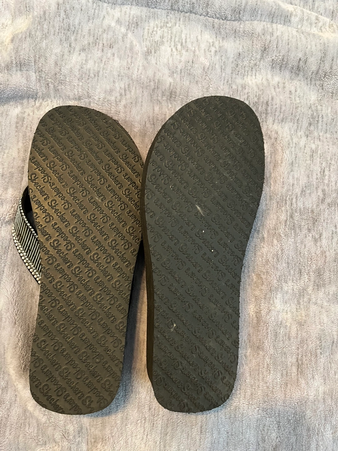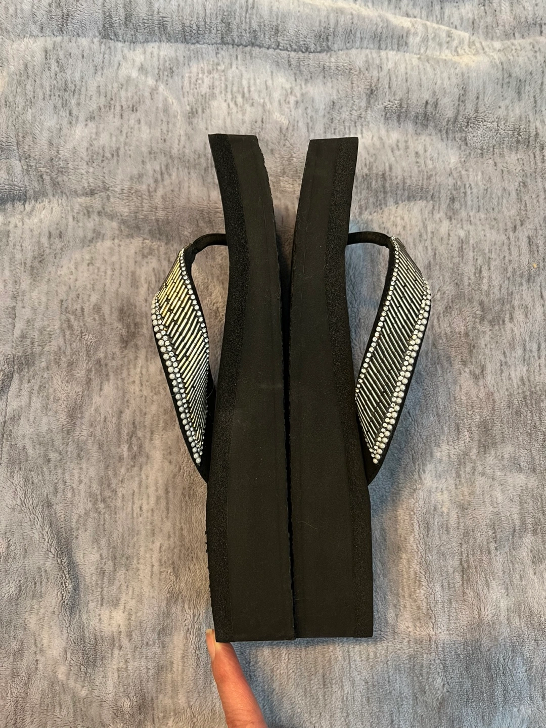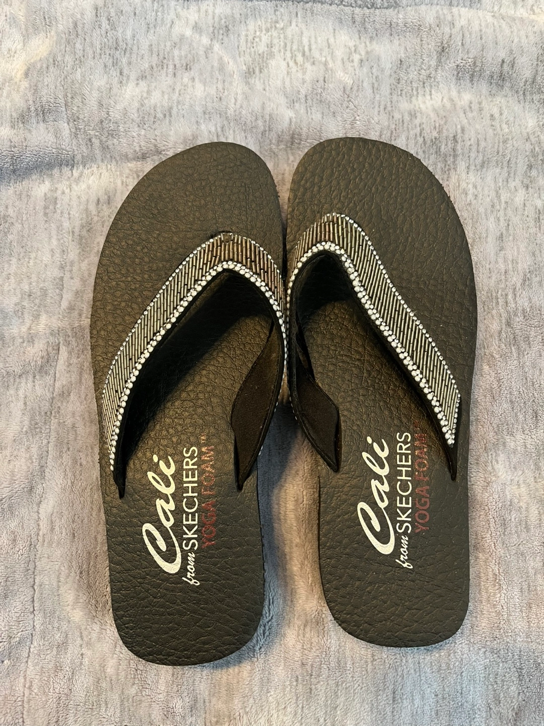 Black flip flops with a thick platform sole and a jeweled strap. From Skechers Yoga Foam collection.