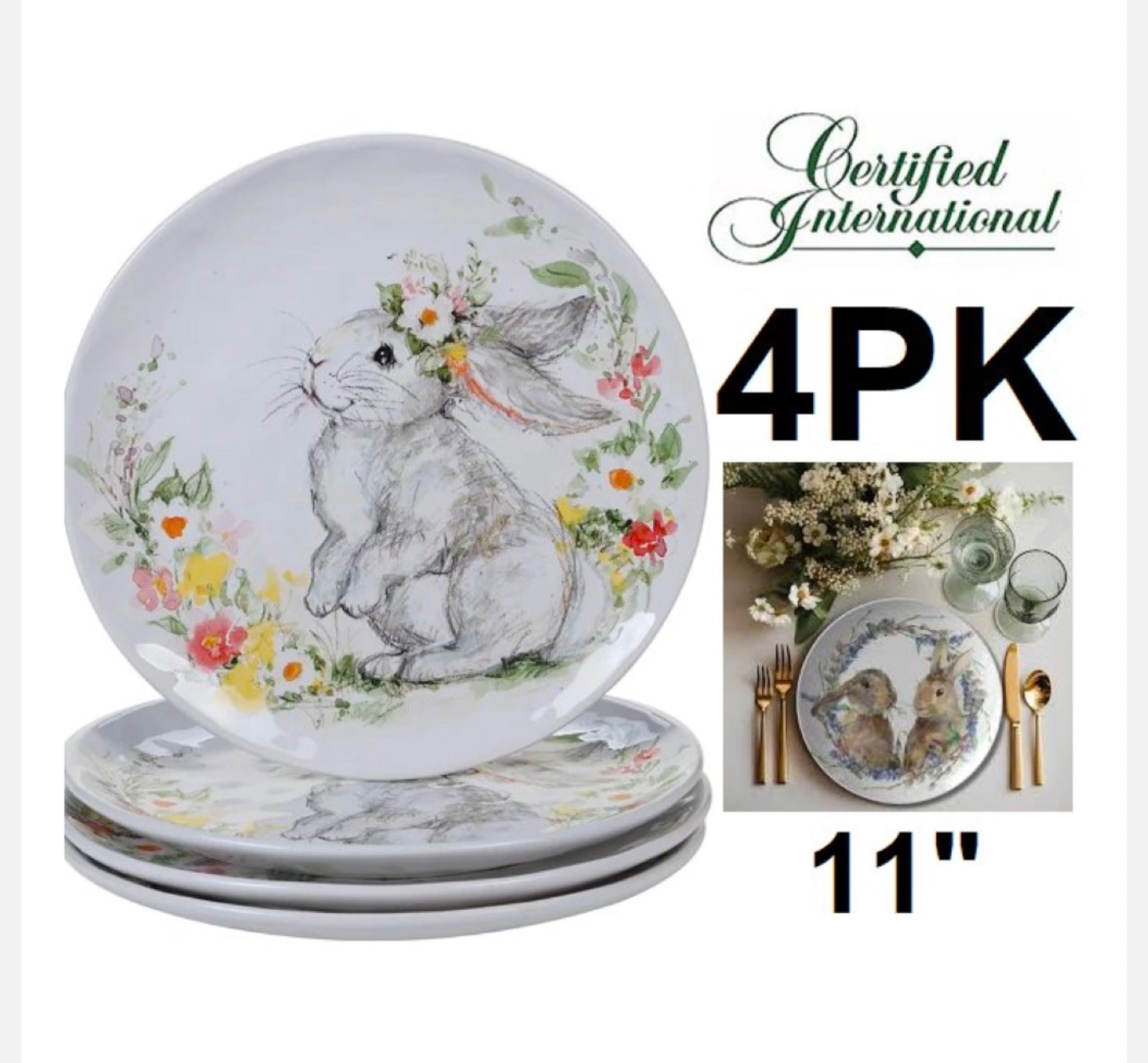 Set of four 11'' plates featuring a bunny design. 4PK CERTIFIED INTERNATIONAL SWEET BUNNY DINNER PLATE SET - 11" - WHITE
