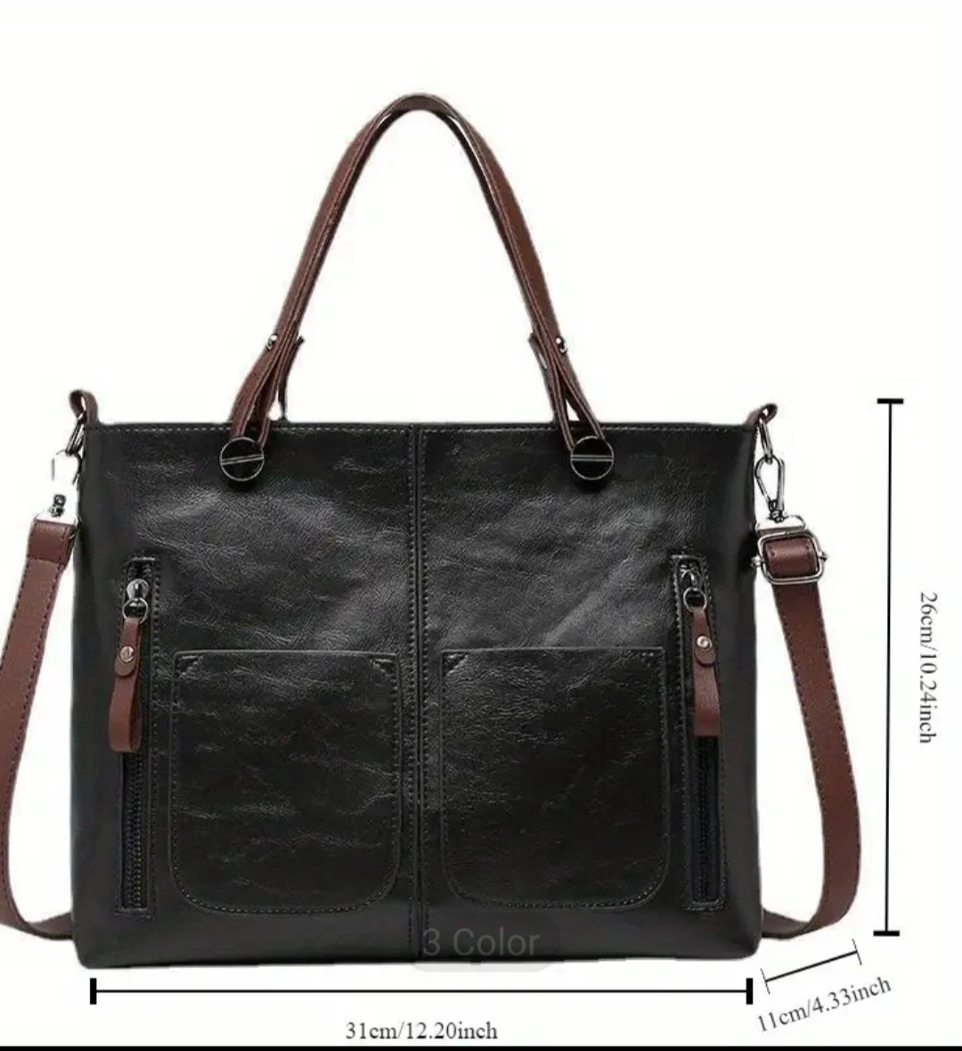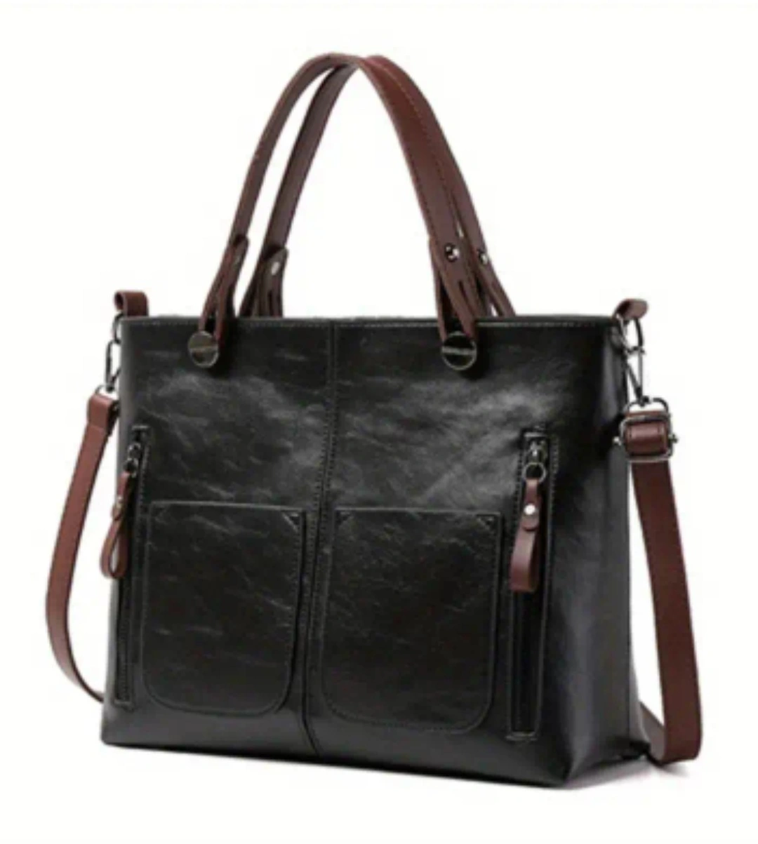 Black faux leather tote bag with two top handles and an adjustable shoulder strap. Has two pockets on the front.