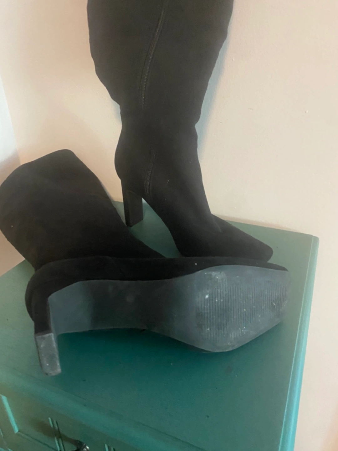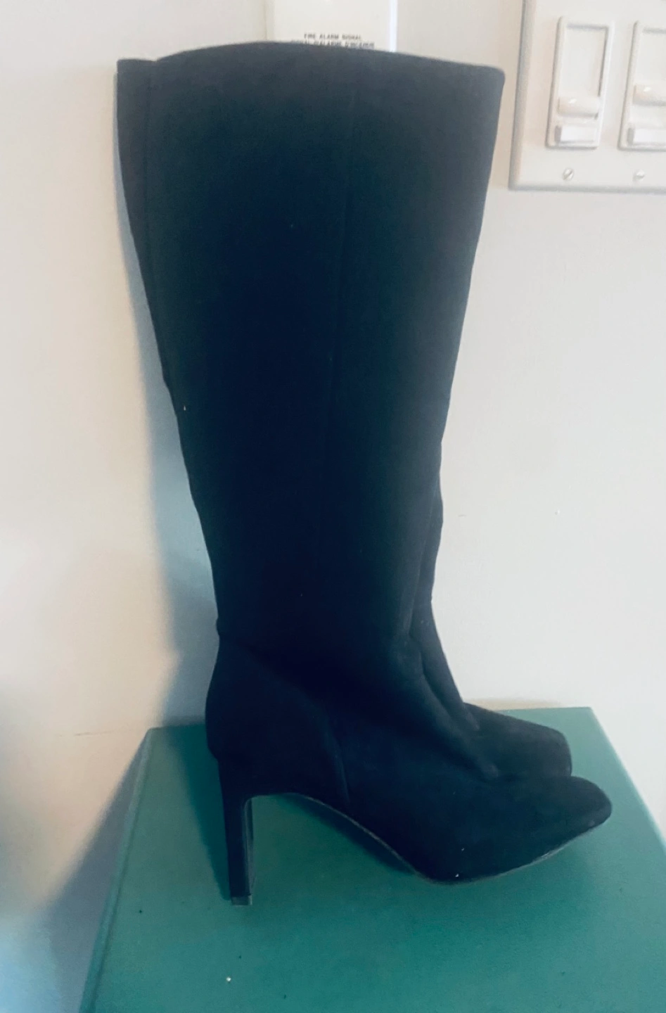 Worn once Black knee high faux suede boots. They have a block heel and a side zipper and 4 in heel