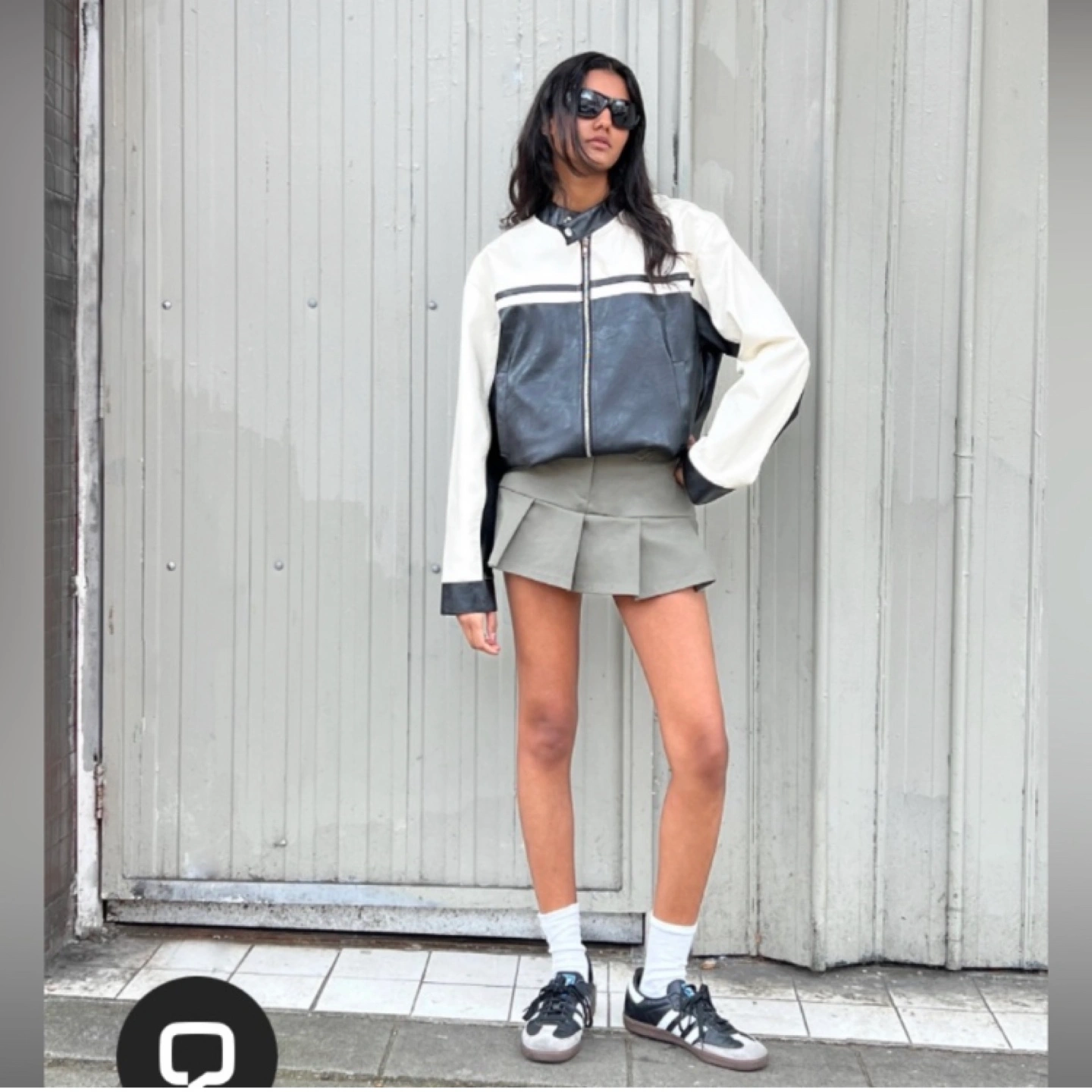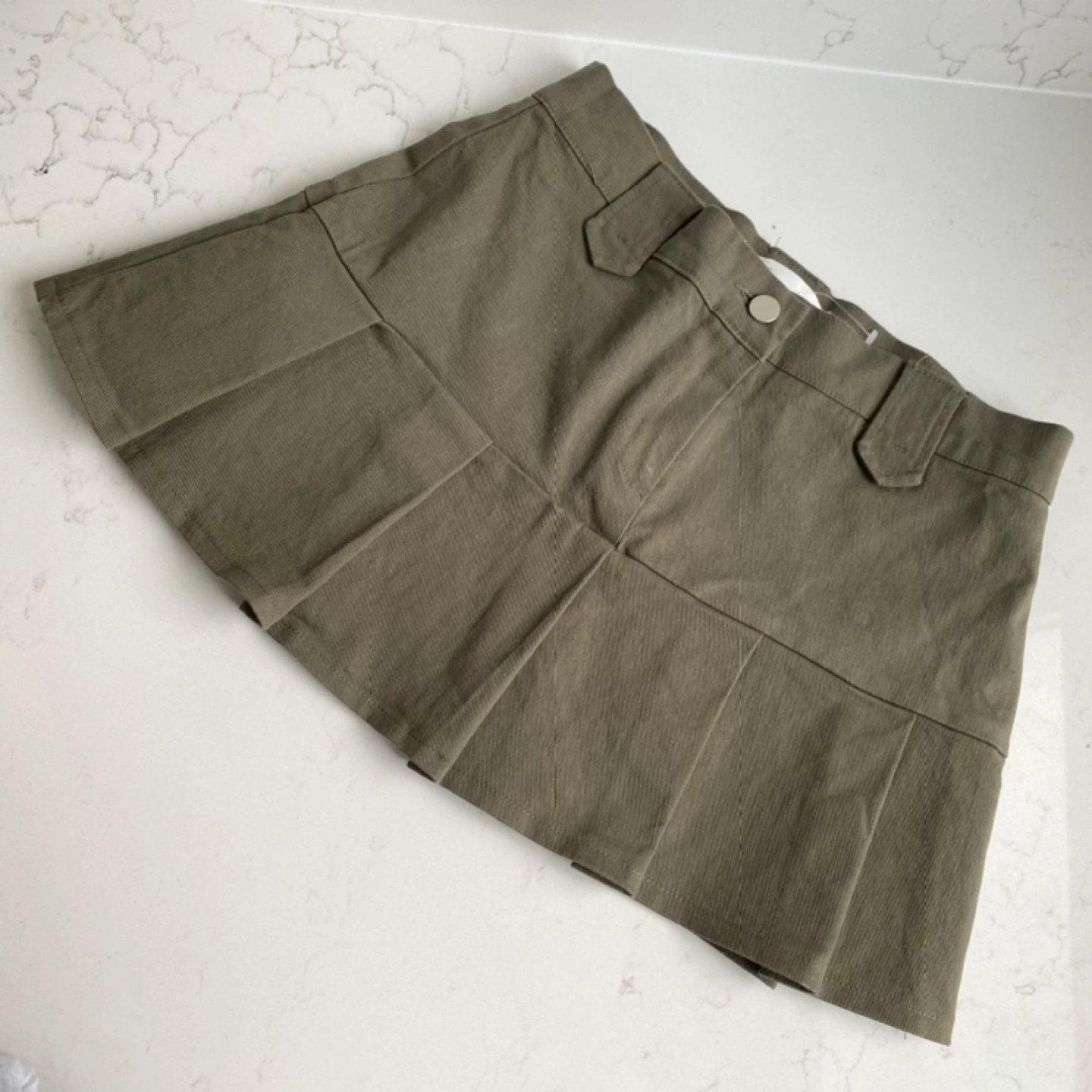 Olive green mini skirt with pleats and a satin lining. Size M. Has inner shorts.