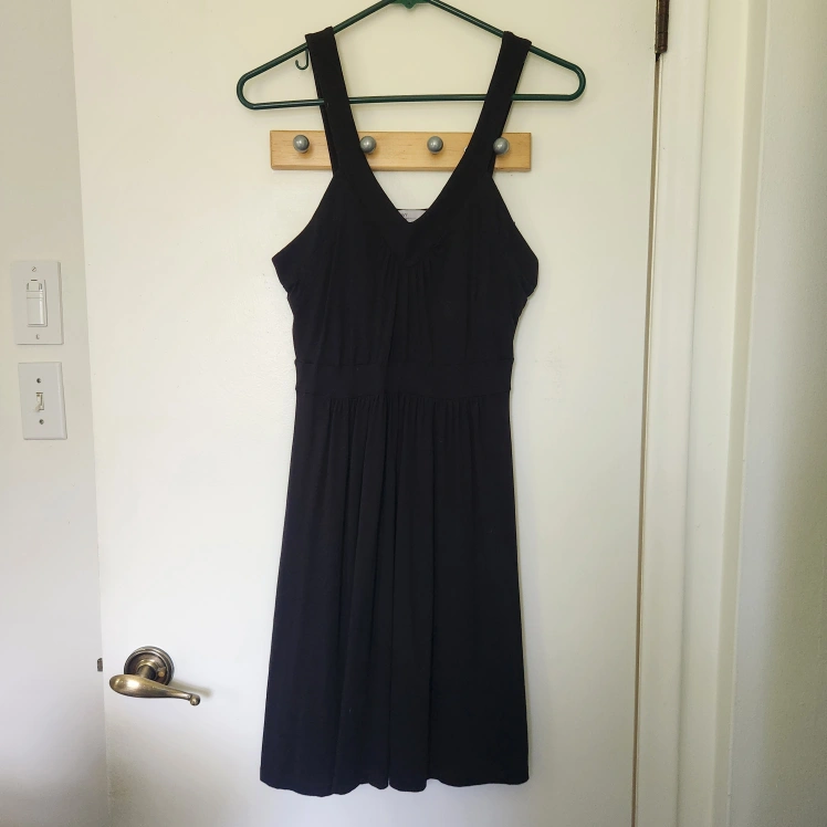 269Black sleeveless summer dress with a V-neck. The dress is a flowy and comfortable style. It has a fitted bodice and a flared skirt.