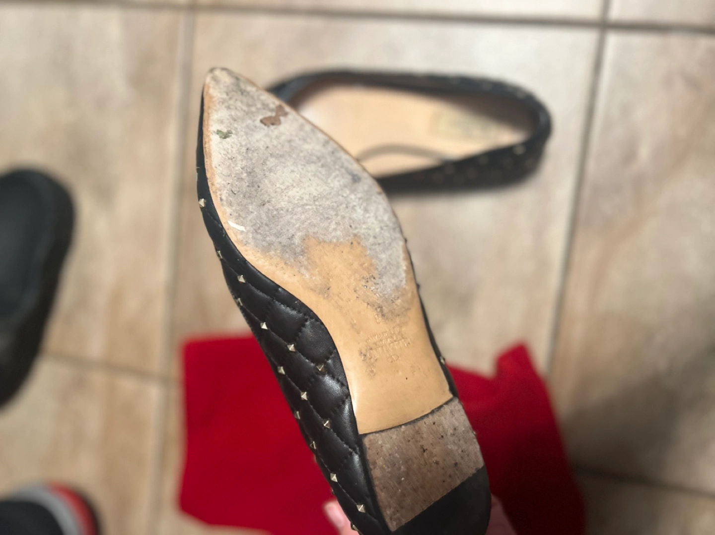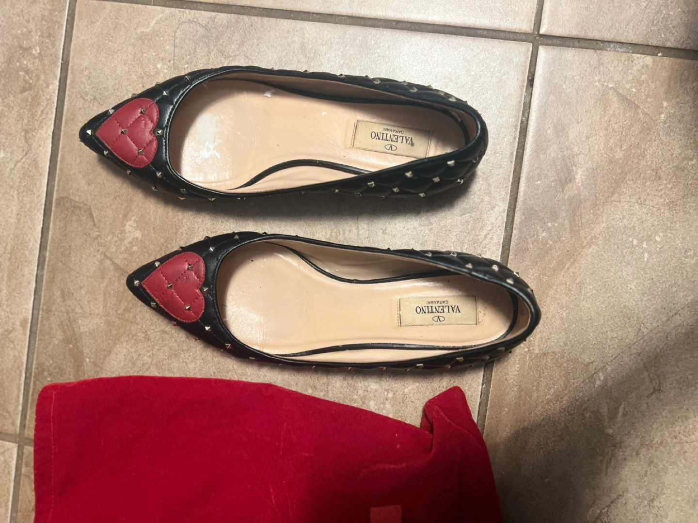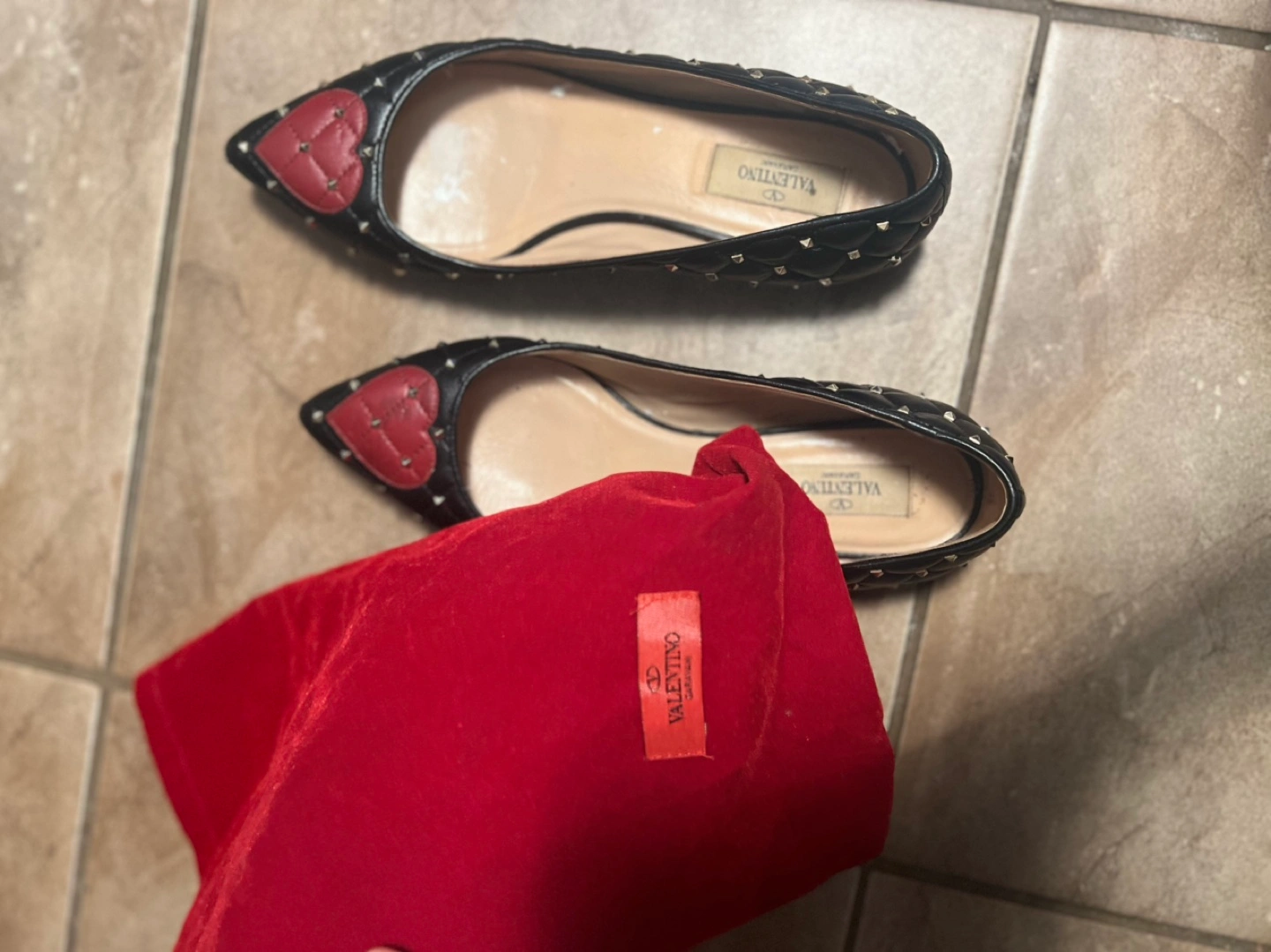 25Black leather flats with a red heart on the toe. Studs all over. Comes with a red dust bag.