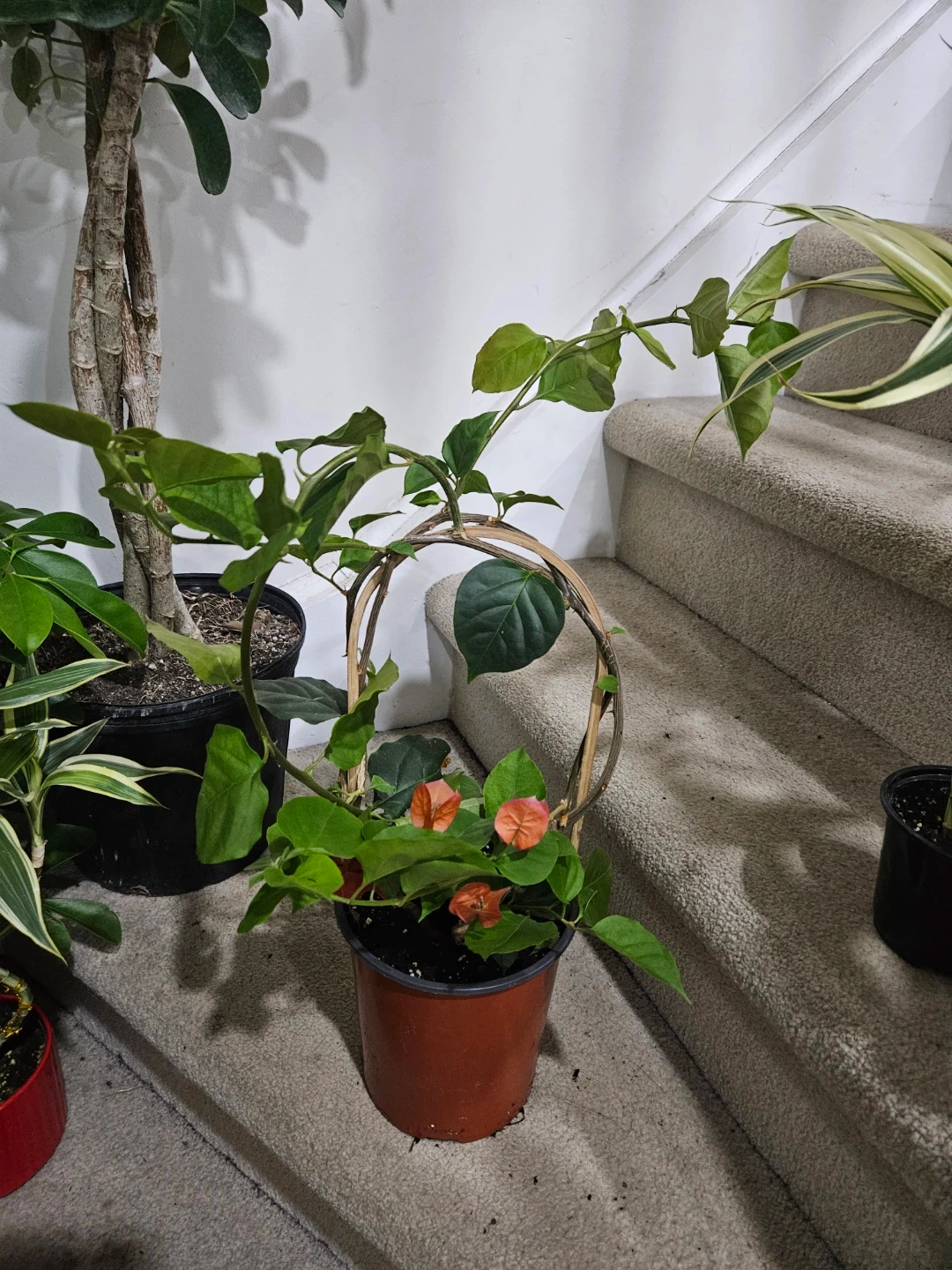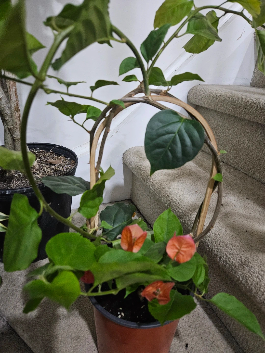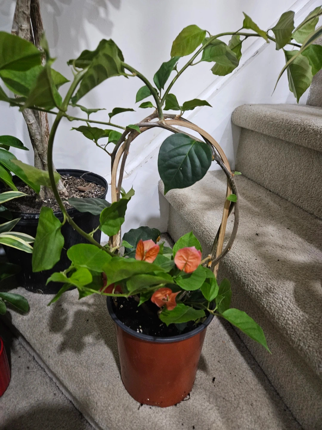 This is a vibrant potted plant featuring beautiful orange blooms. It's currently supported by a wooden trellis. It would add a lovely touch to any indoor space!