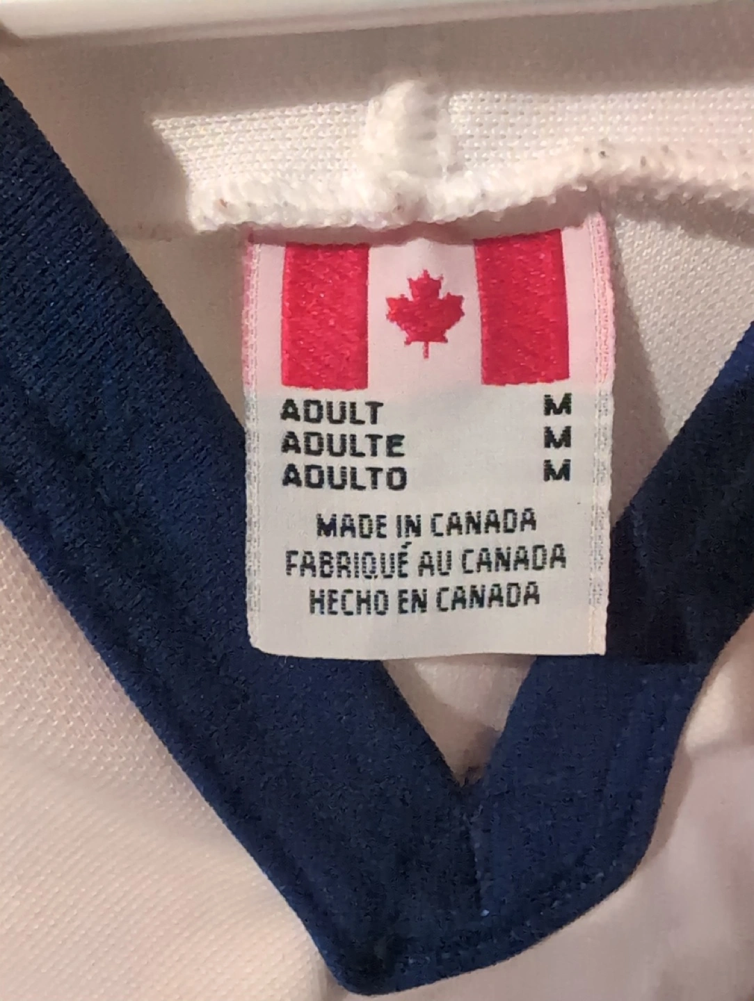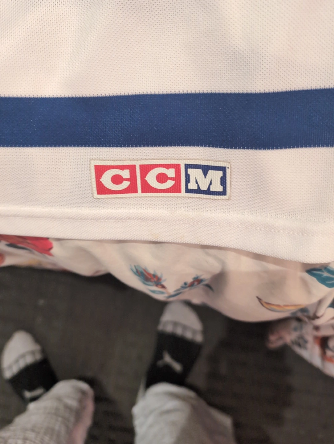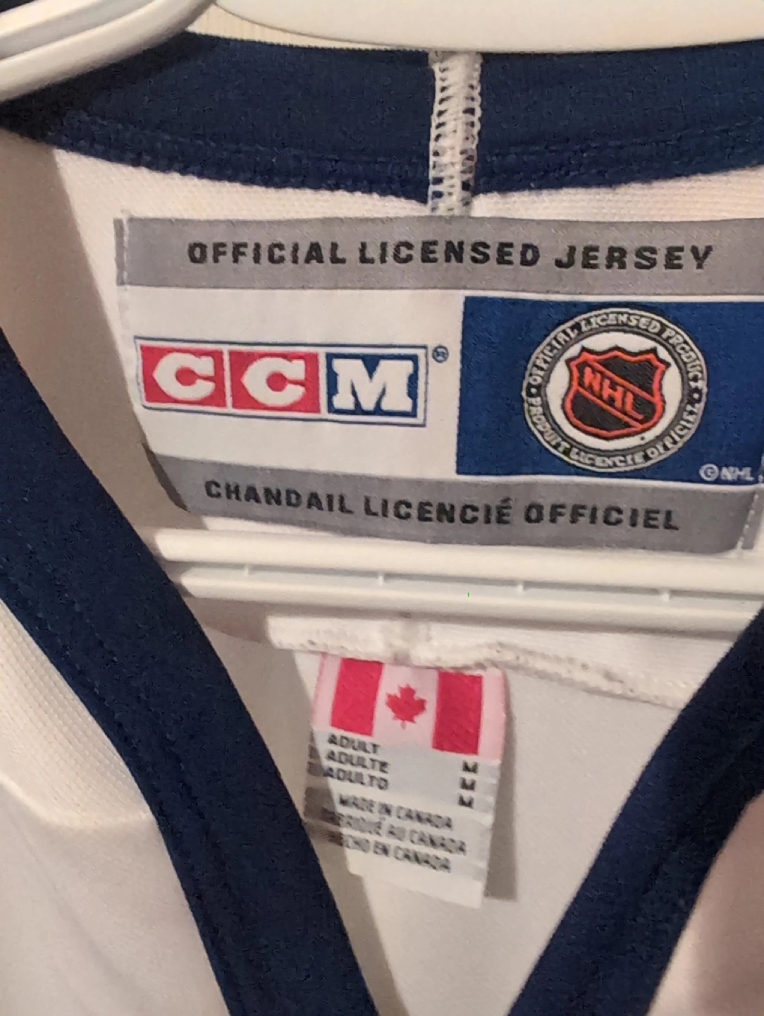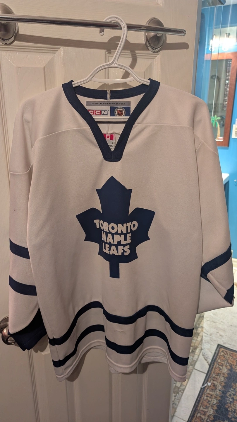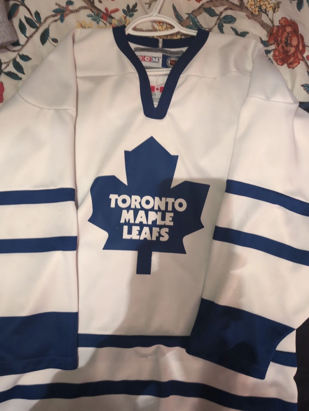 White Toronto Maple Leafs jersey with blue and white stripes. CCM brand. Official license jersey