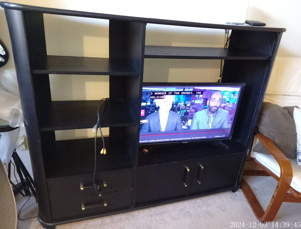 Black entertainment unit with five open shelves for components, games, books, or plants, etc., two drawers & two doors for closed storage and a space for a 32" TV (not included). Has some very minor scratches from normal use.