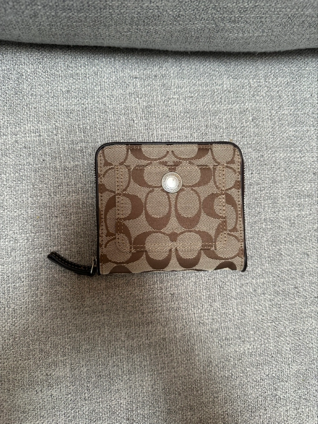 Brown Signature Coach wallet size medium. Features a zipper closure and multiple card slots. Excellent condition.