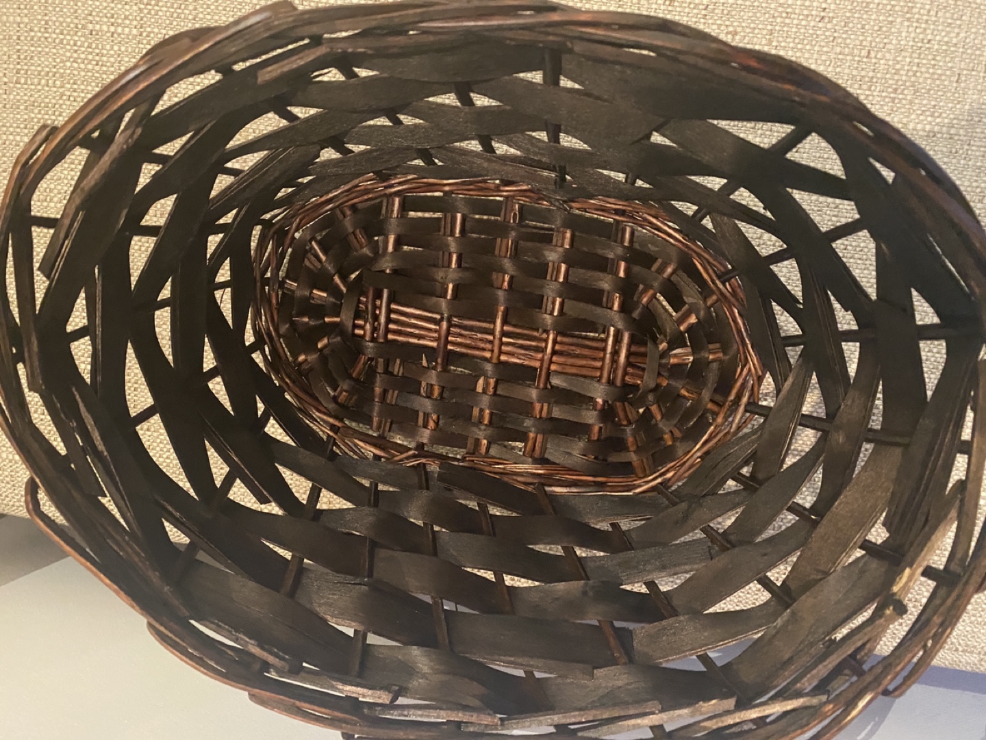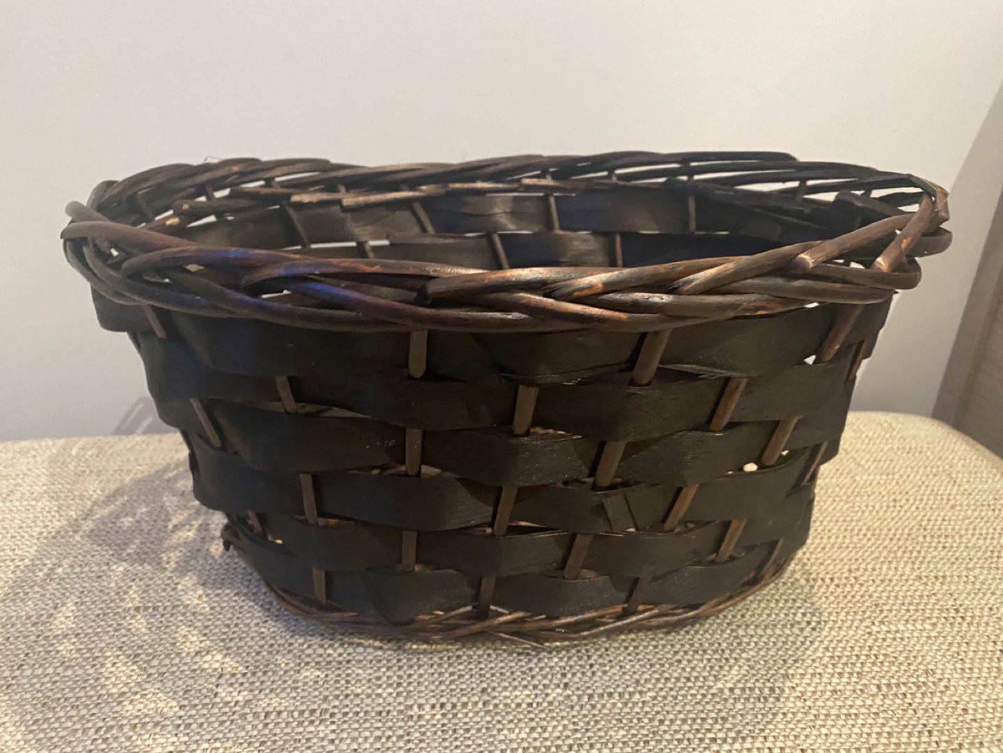 Wicker basket. Brown with black woven strips. Oval in shape.