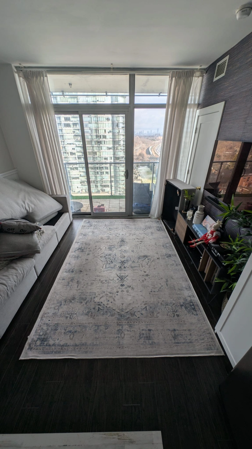 Gorgeous area rug from Ruggable, in blue/grey tones. It comes with a matching grip pad underneath and is machine washable. Great for condo living rooms and/or families with small children.