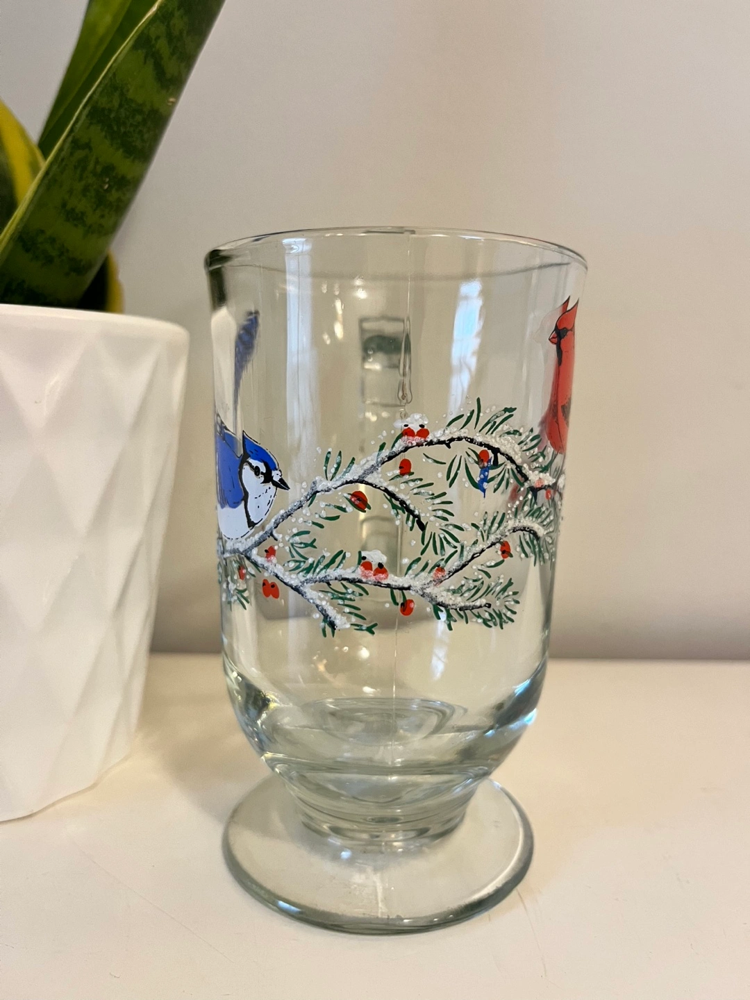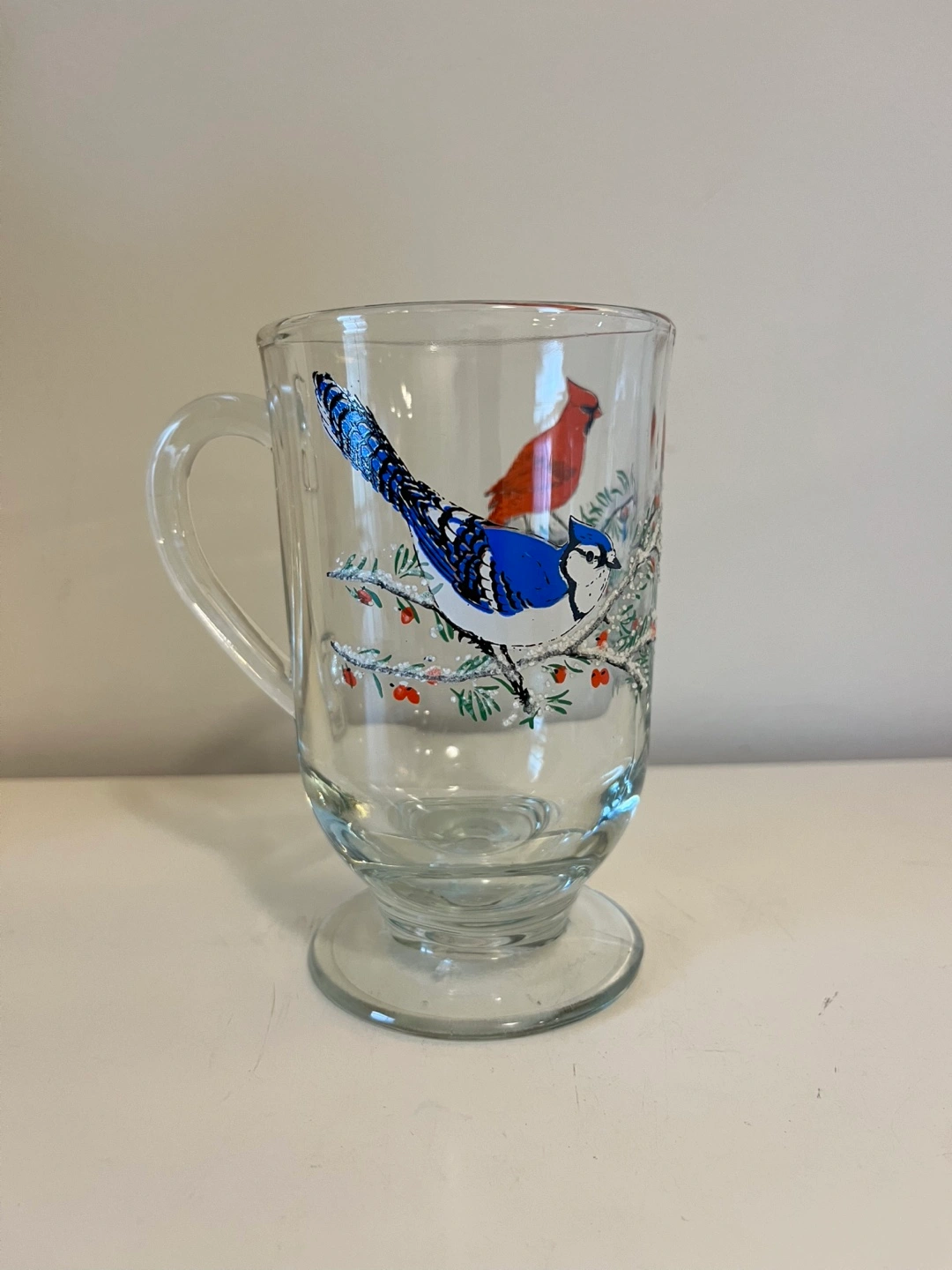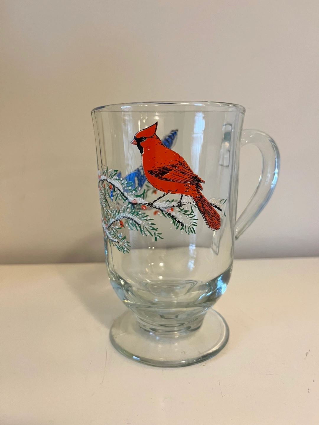 165Glass mug with blue jay and cardinal design. Has a foot. Perfect for your holiday decor or year round for that birder in your life! All sales final. Curbside pick-up Woodbine and Gerrard