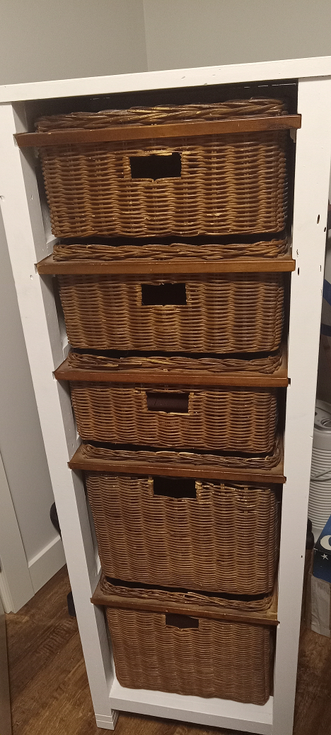 White wood unit with Wicker basket, lined drawers in good condition. Some light wear on the front of drawers.
