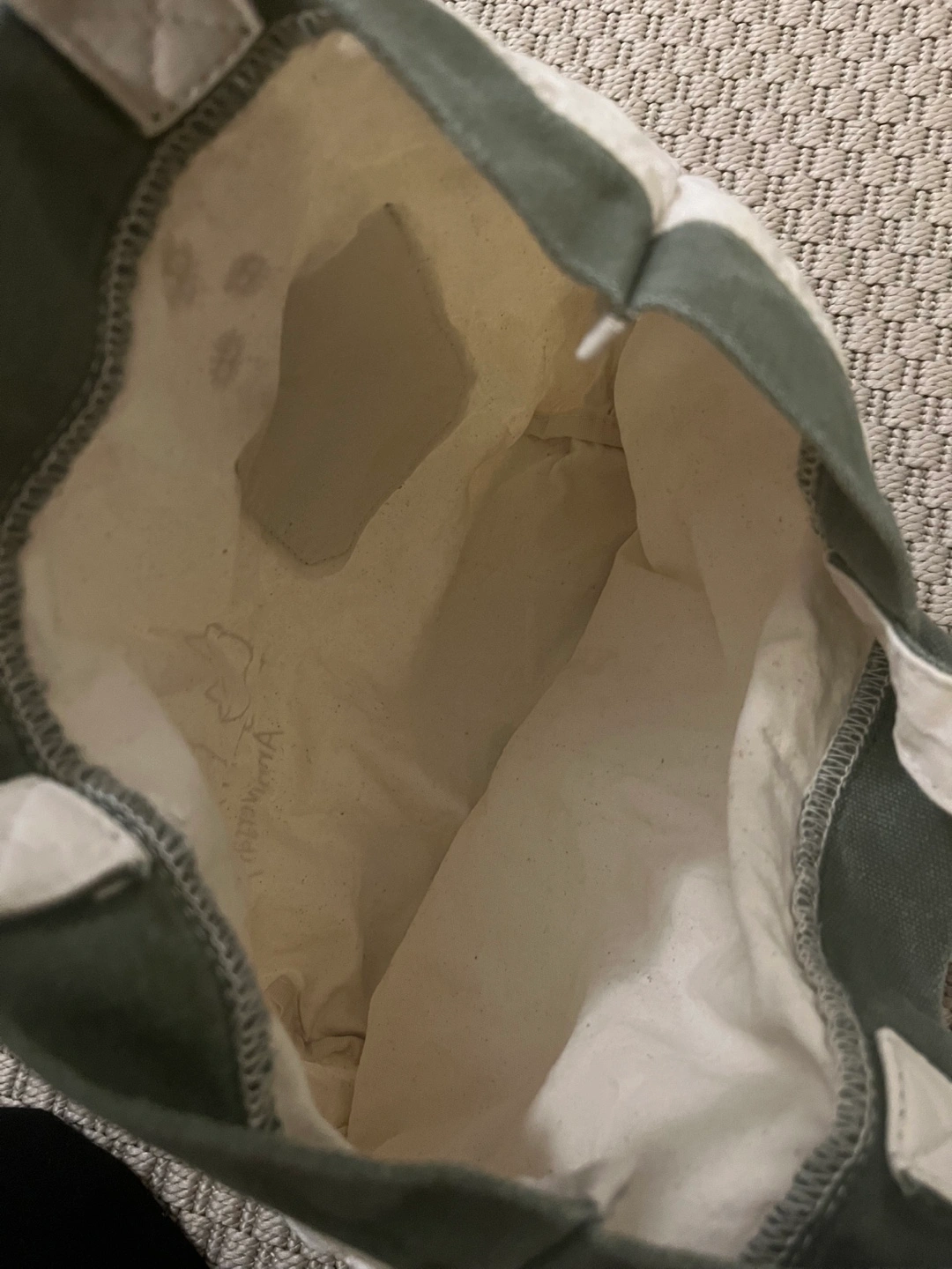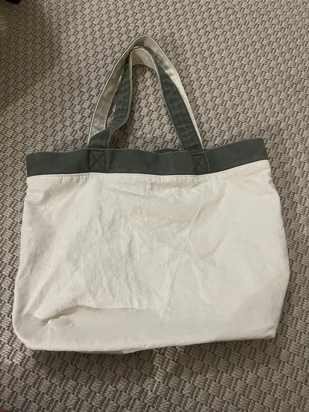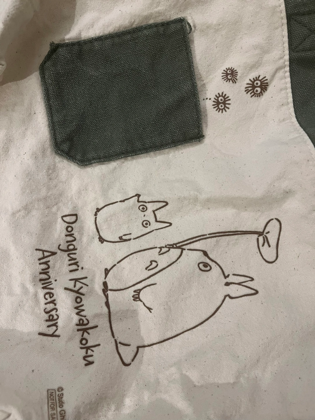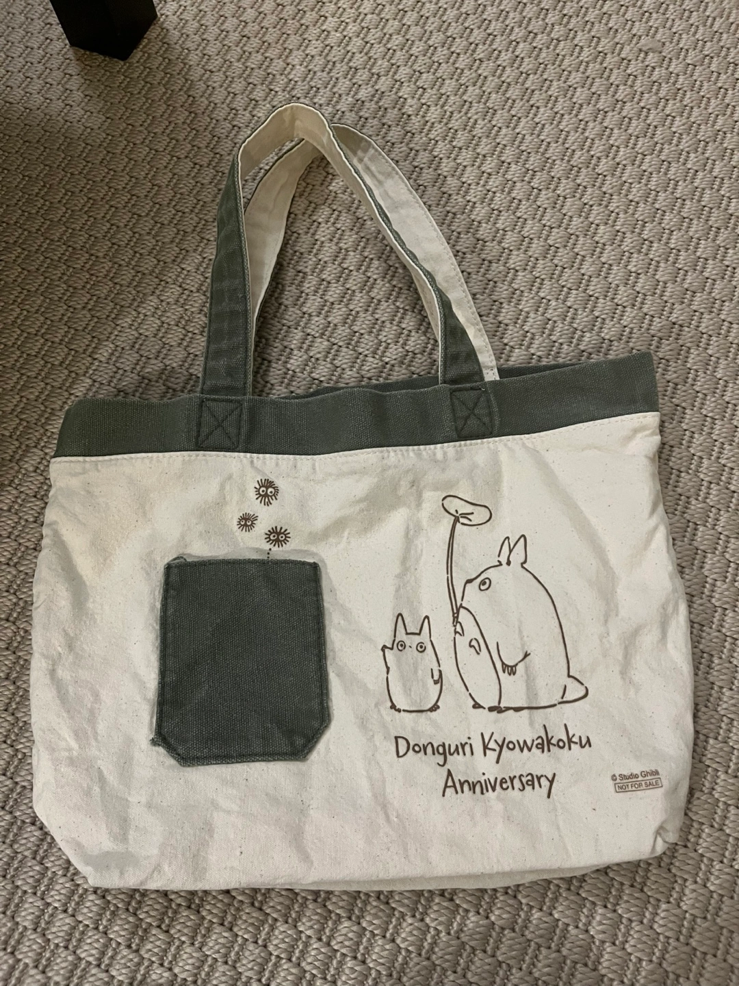 290Totoro tote bag with a green trim and a small pocket on the front. It has a design of Totoro and a small Totoro on the front. Not for sale limited souvenirs from Studio Ghibli