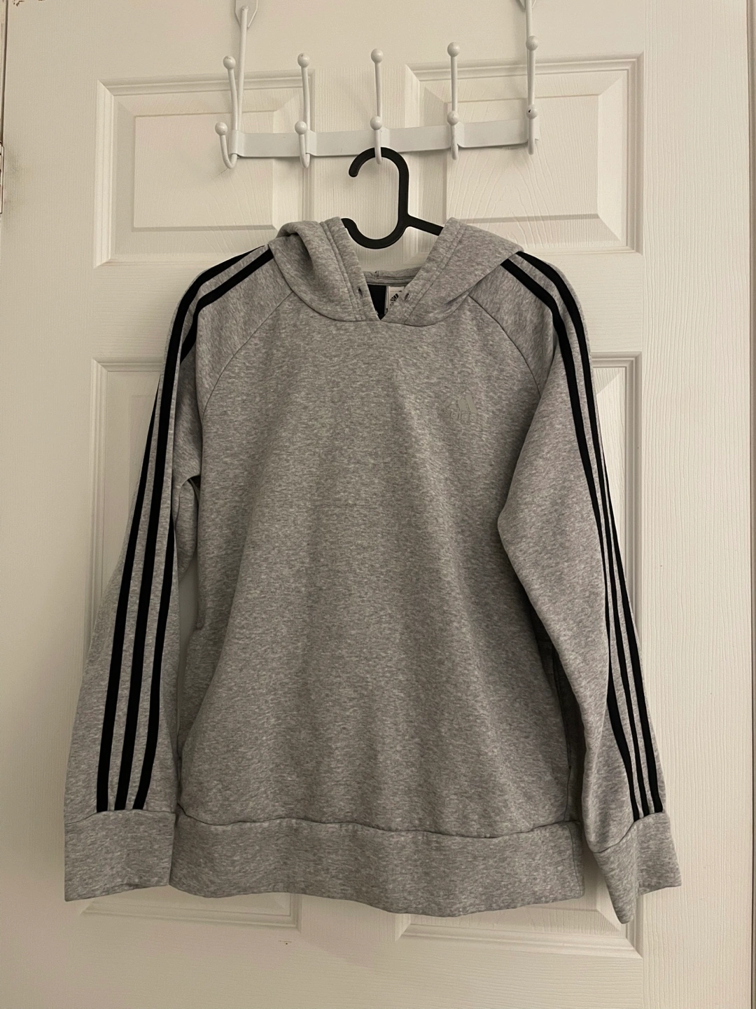 Grey hoodie with black stripes on the sleeves. Long sleeves. Hoodie has a pouch pocket. Size Medium.