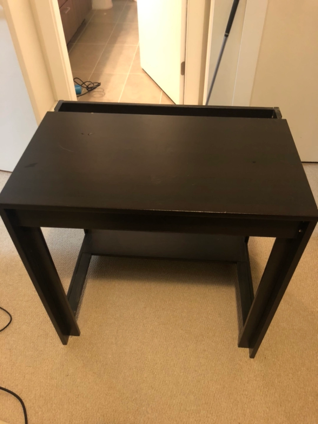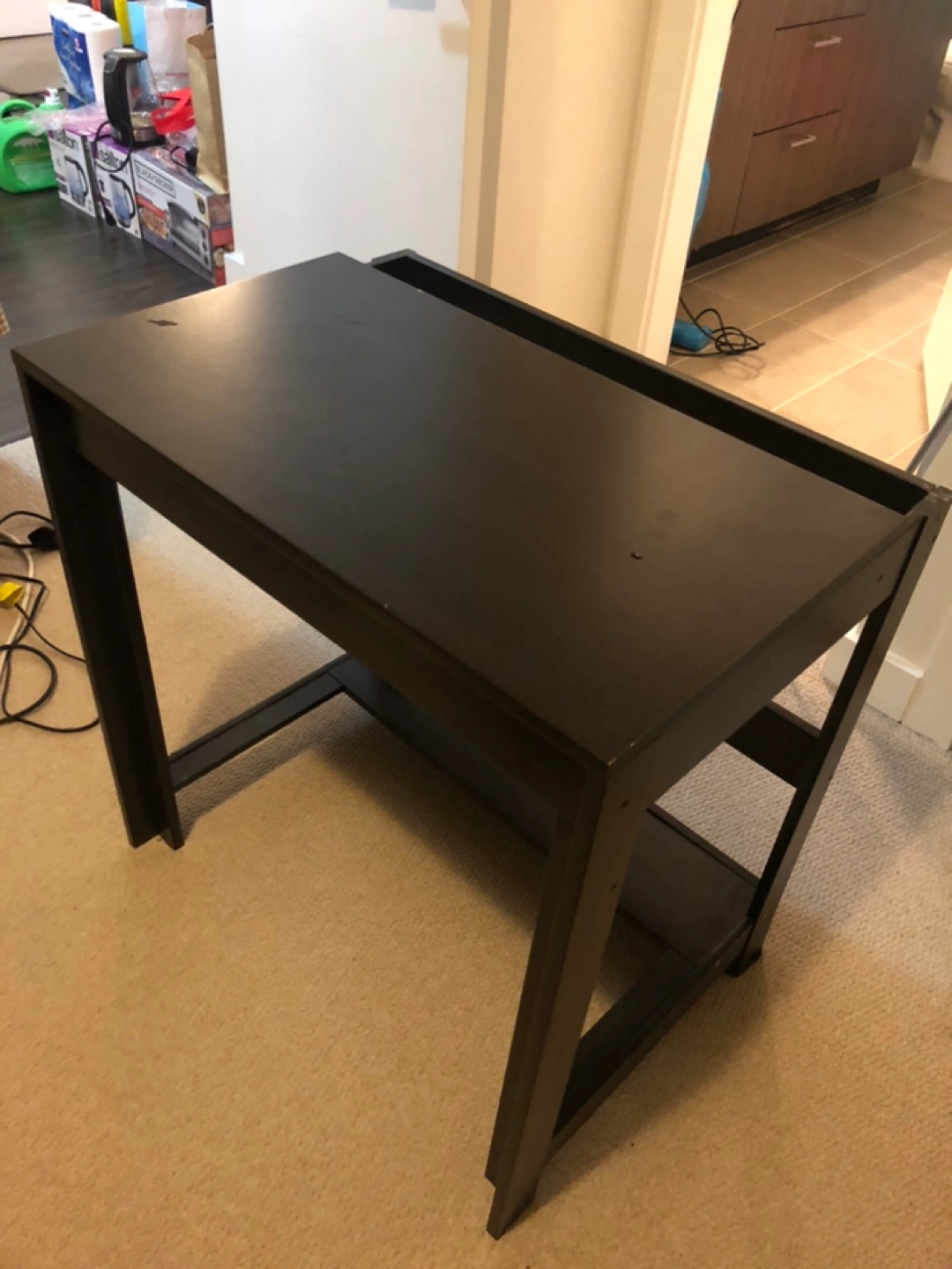 Small dark brown desk with a shelf and a pull-out drawer. In good condition but has some scratches on top.