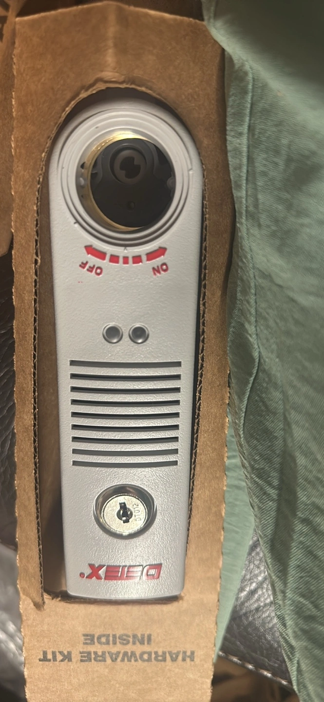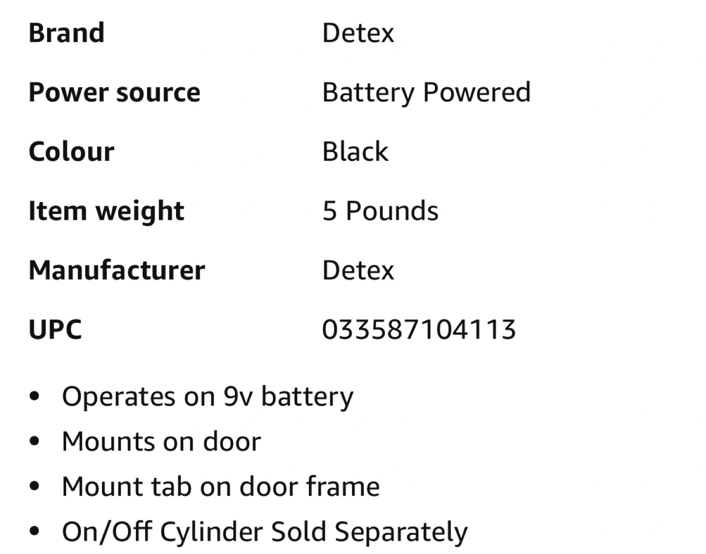 Battery powered. Mounts on door with a tab on the door frame. Operates on 9v battery. On/Off Cylinder Sold Separately.