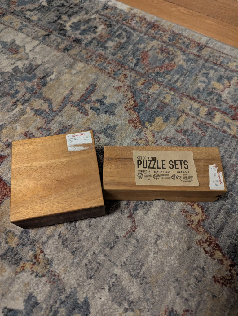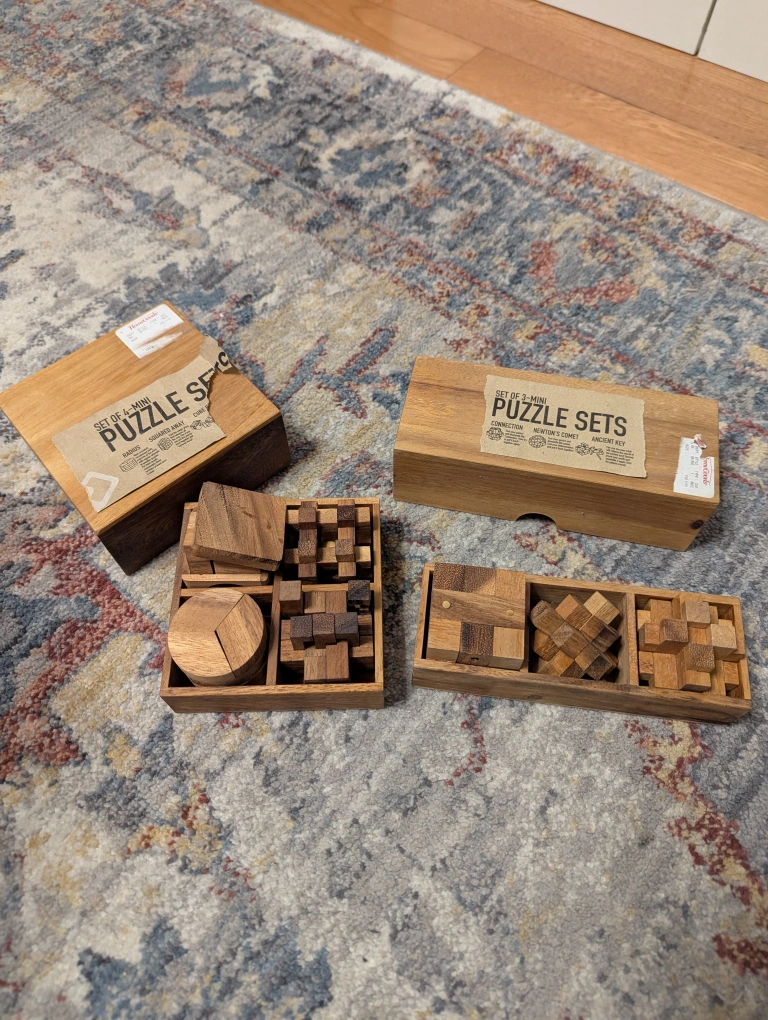 two sets of wooden puzzles. Each set includes multiple puzzle pieces in a wooden box.