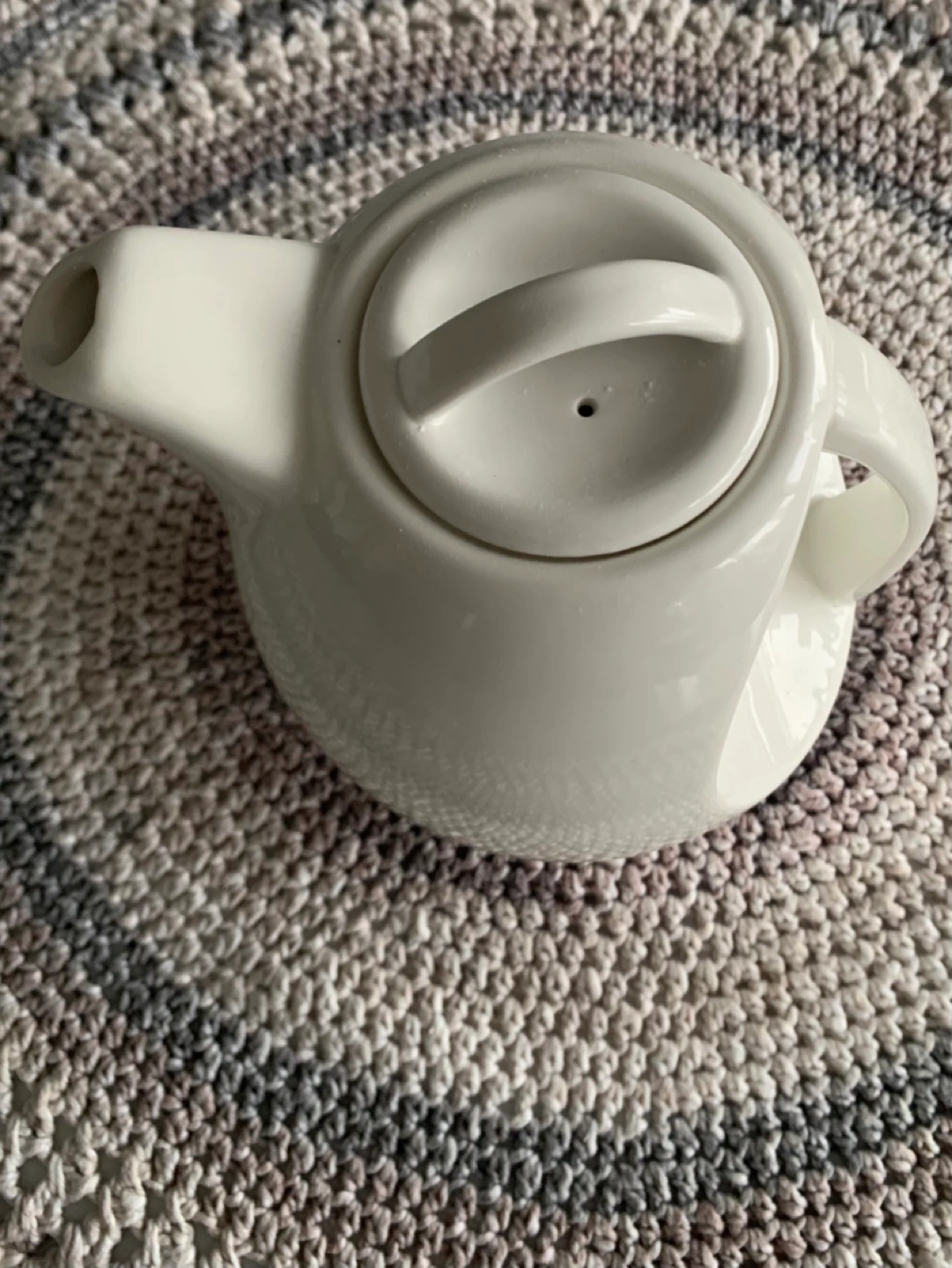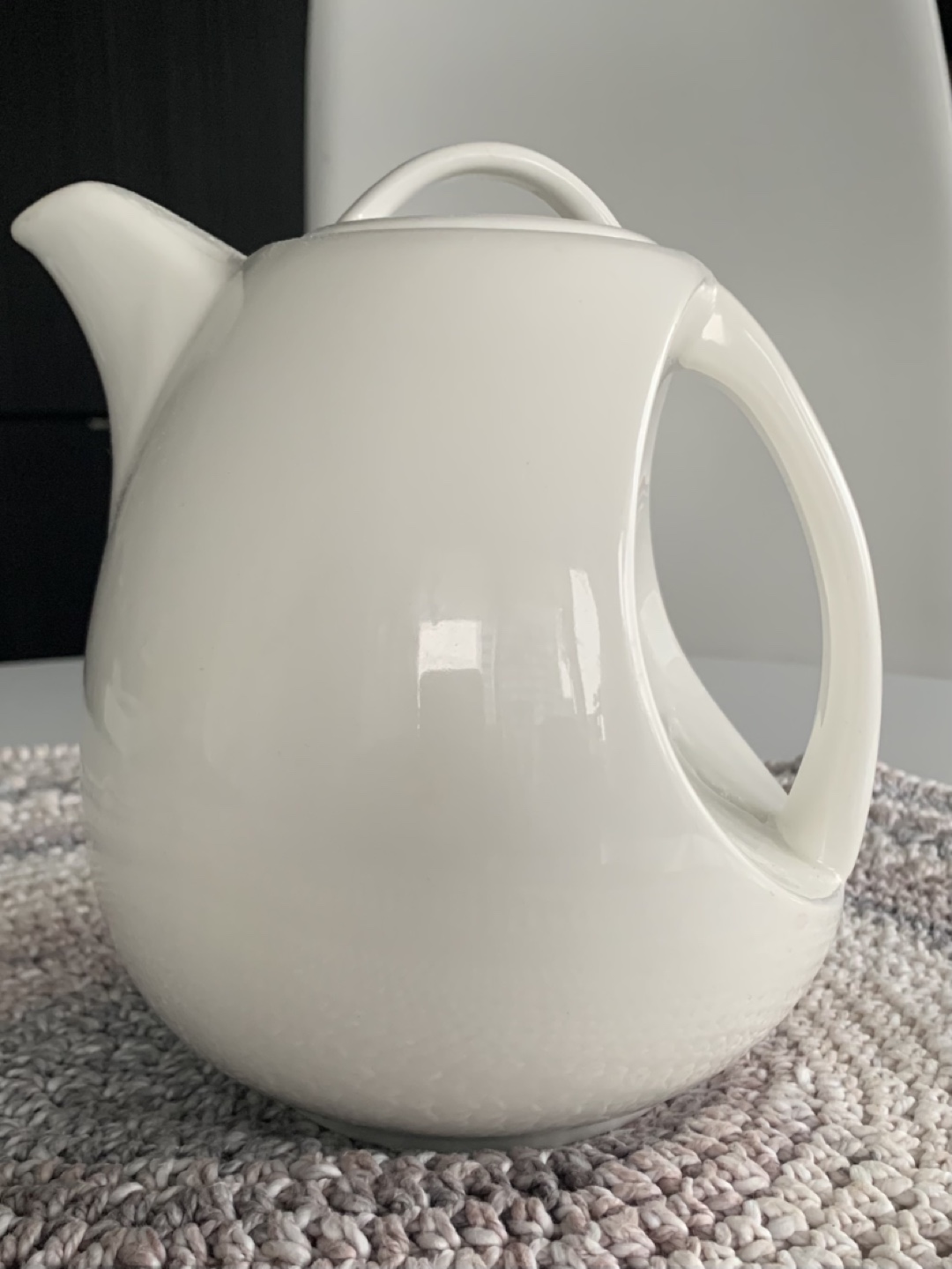 White teapot with a unique design. Has a large handle and a lid with a small hole for steam to escape.