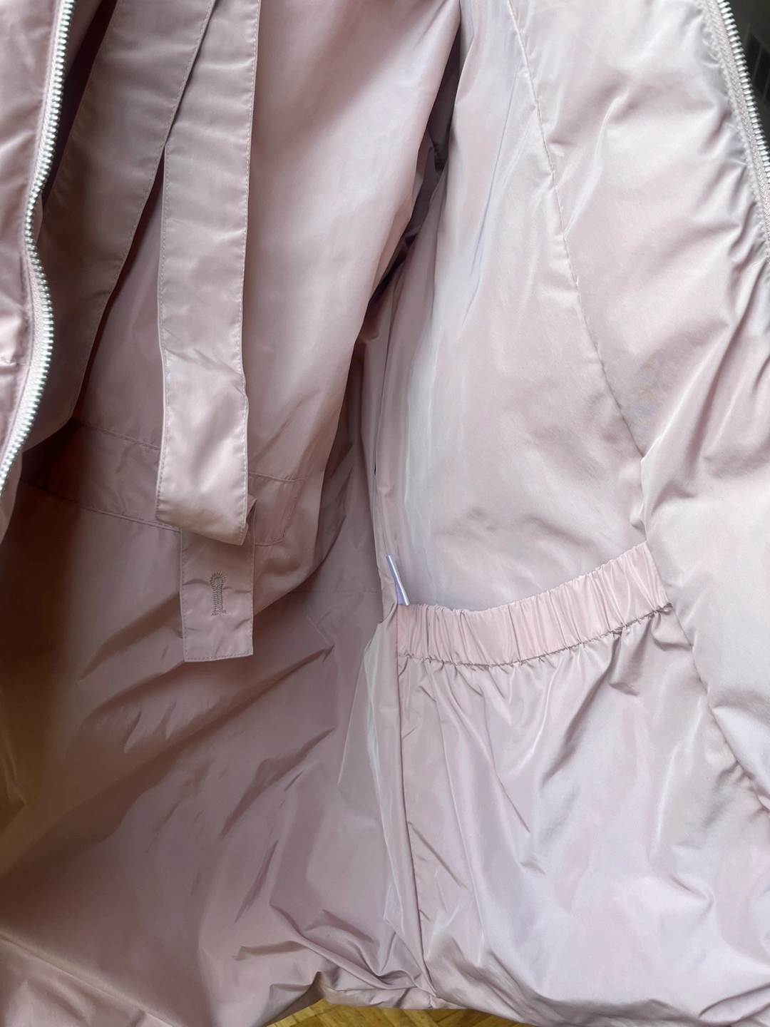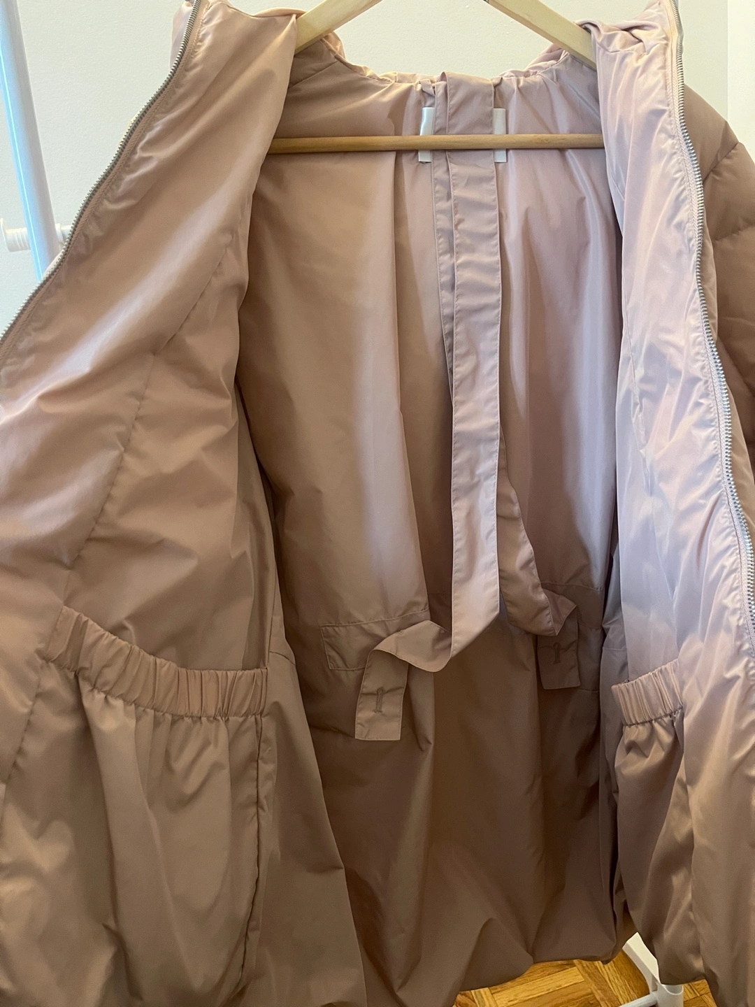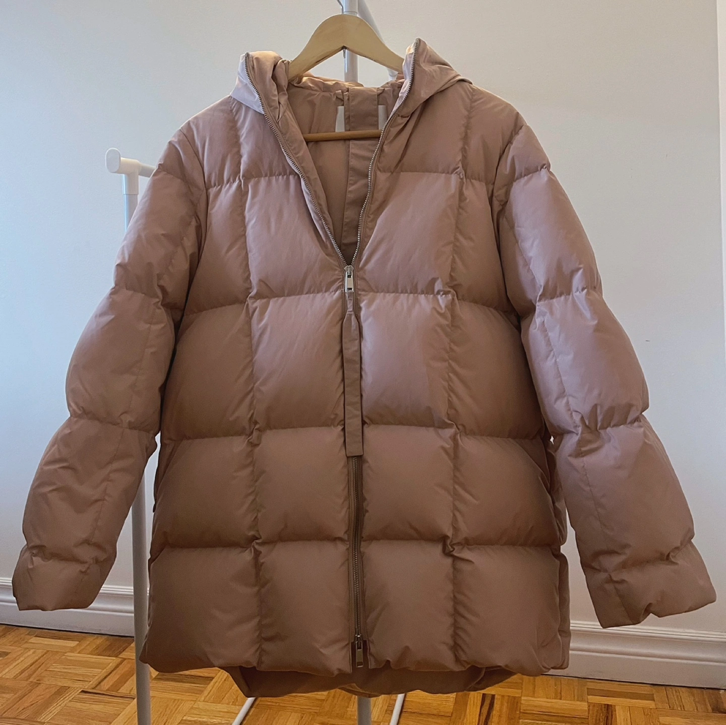 Warm, oversized puffer jacket. It has a hood. It has two zippered pockets on the sides. This down jacket is filled with 95% goose down.Wore once only.Cash only