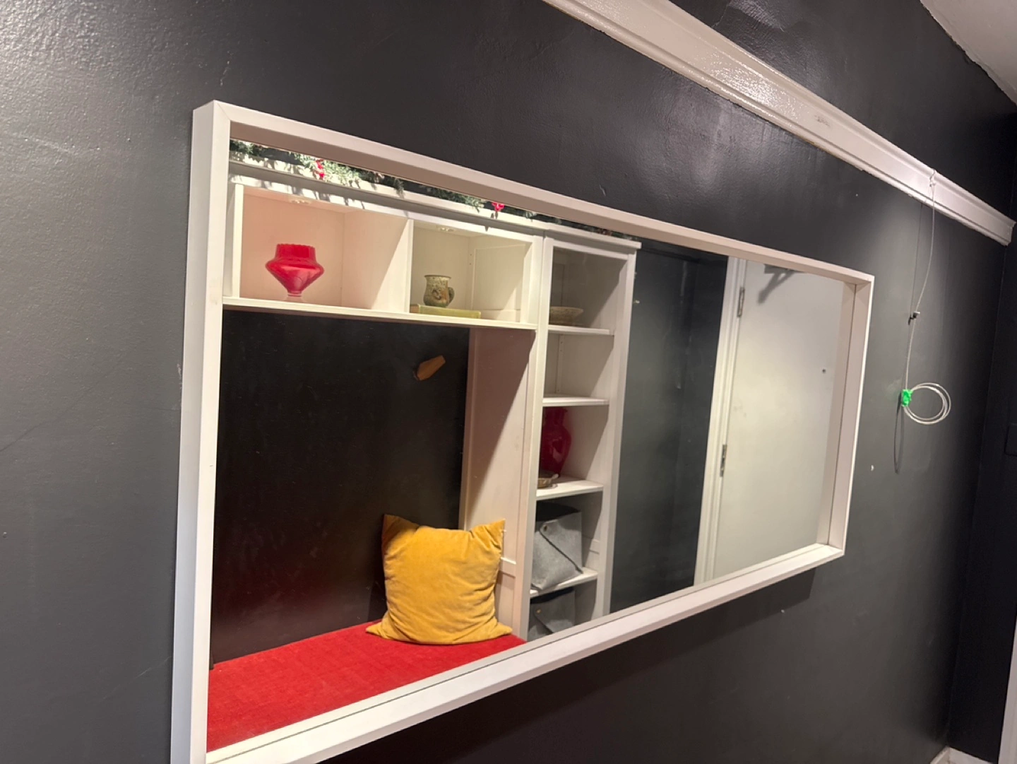 175Large white framed mirror with a built-in shelf. Has a red cushion and a small shelf for decorative items.