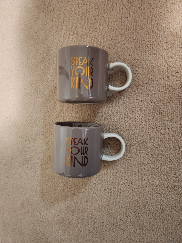 Set of 2 Starbucks mugs. Grey with white handle. Speak your kind written in gold on the front of each mug.
