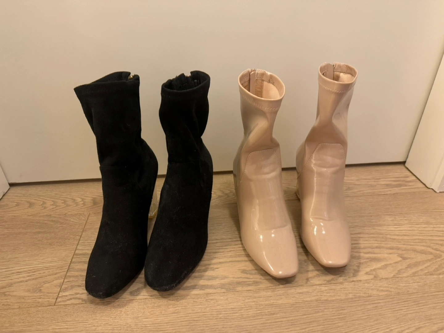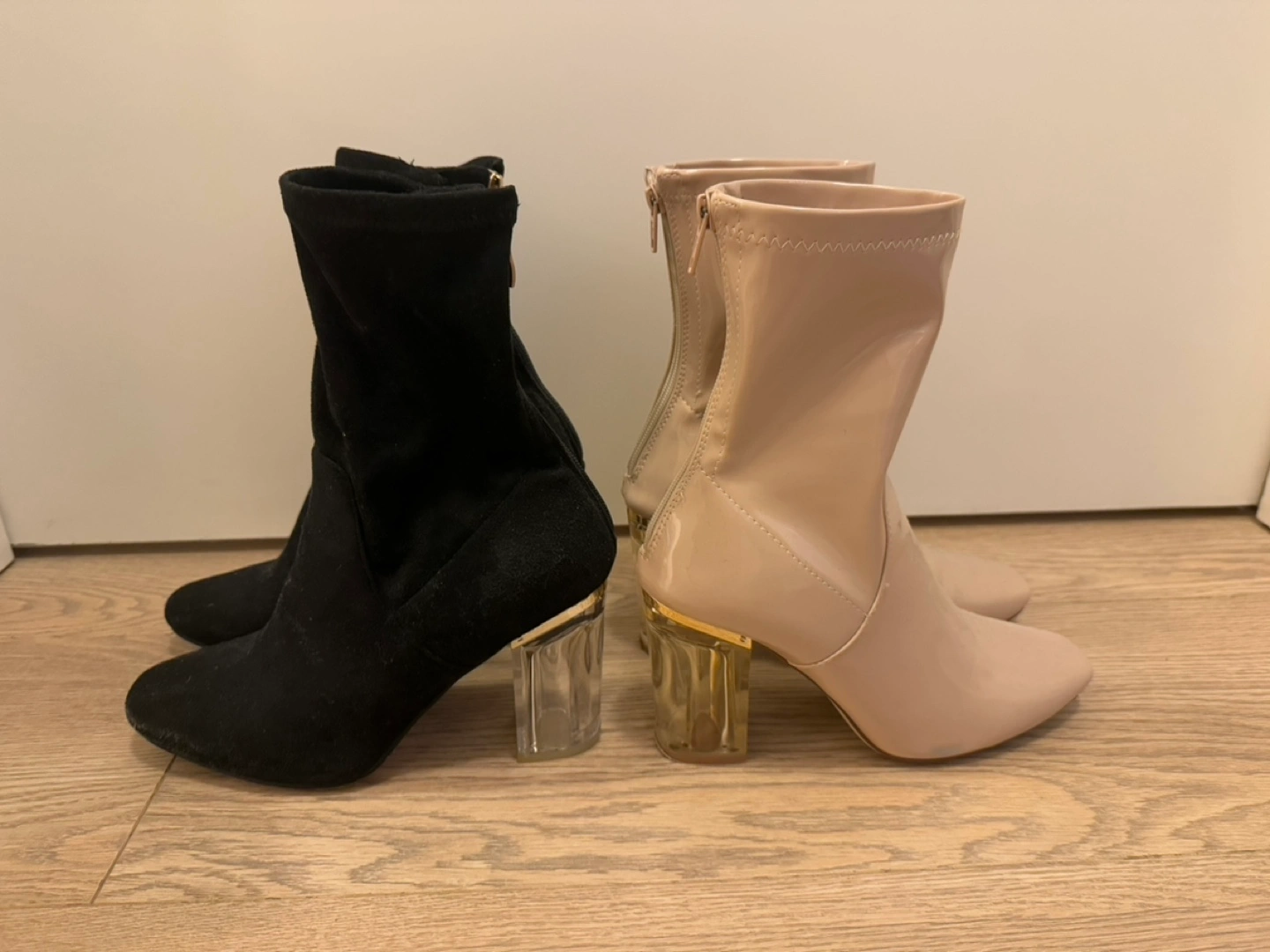 Two pairs of heeled boots with a clear block heel. One pair is black suede and one pair is nude patent leather. Both pairs are size 7.