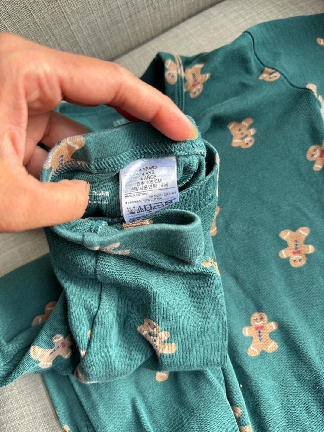 Green pajama set with gingerbread men print. Long sleeve top and long pants. Size 4 years. In the last photo stitch opened