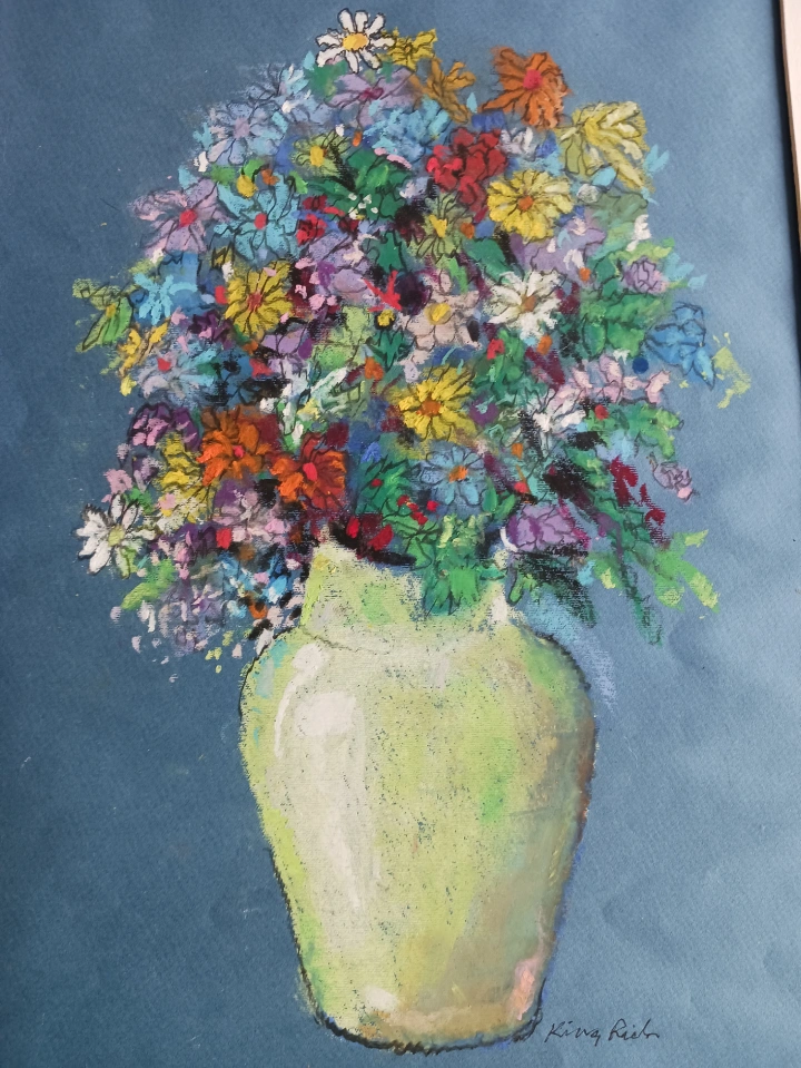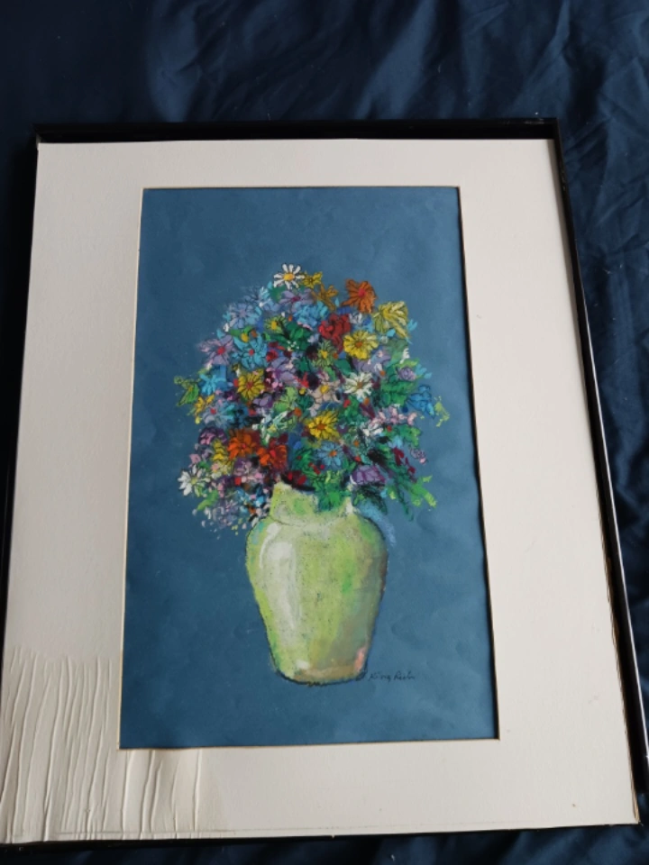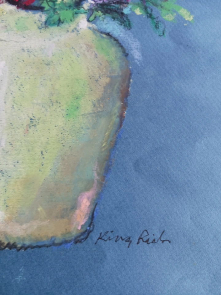 Framed pastel painting of a flower arrangement in a vase. Signed by the artist "King Rich".