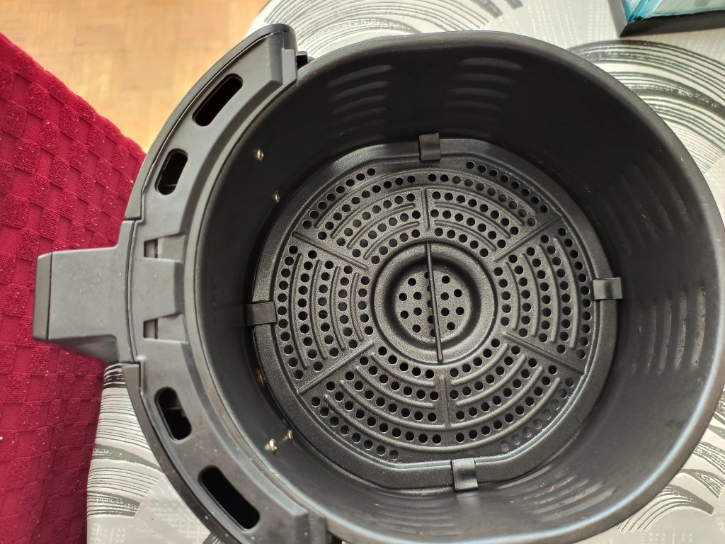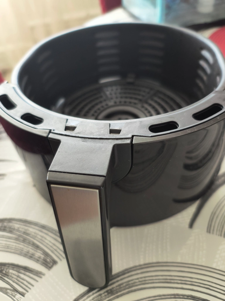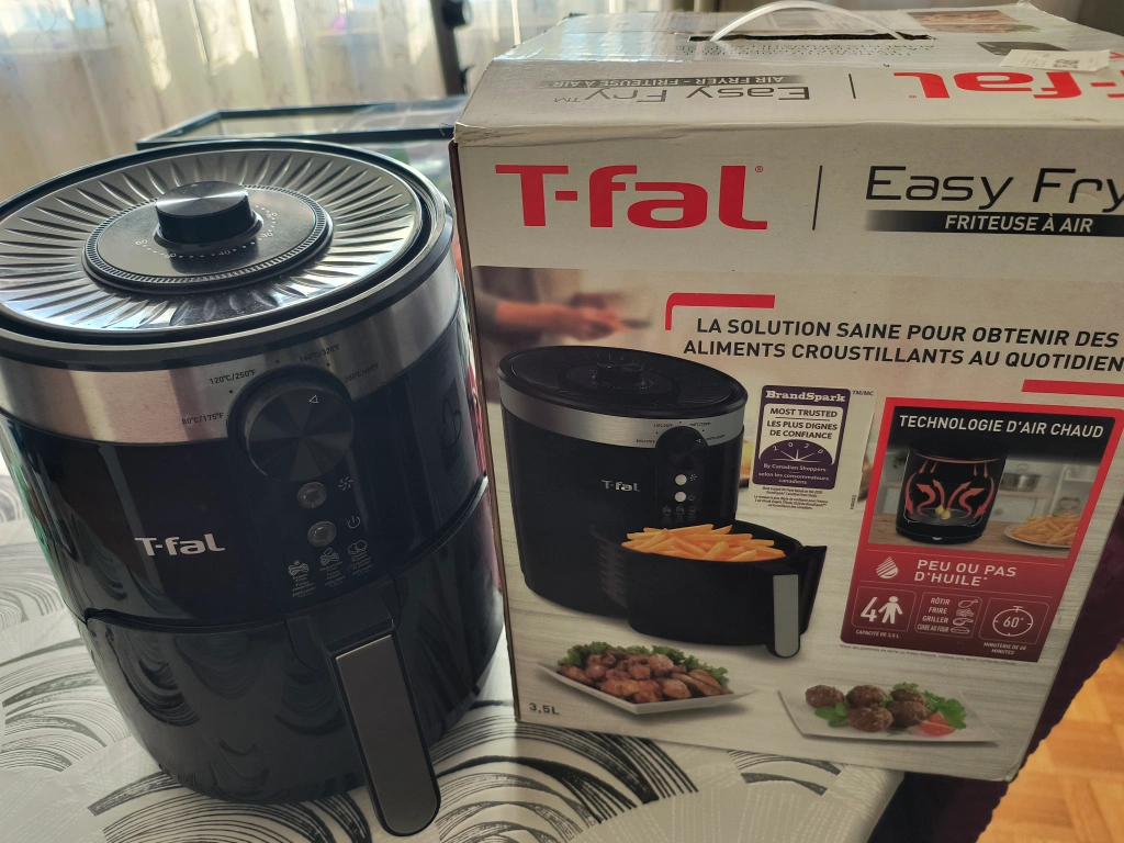 Black T-fal air fryer with removable basket. Has a timer and temperature control. 3.5L capacity. Has been used only a few times, only HALAL food.