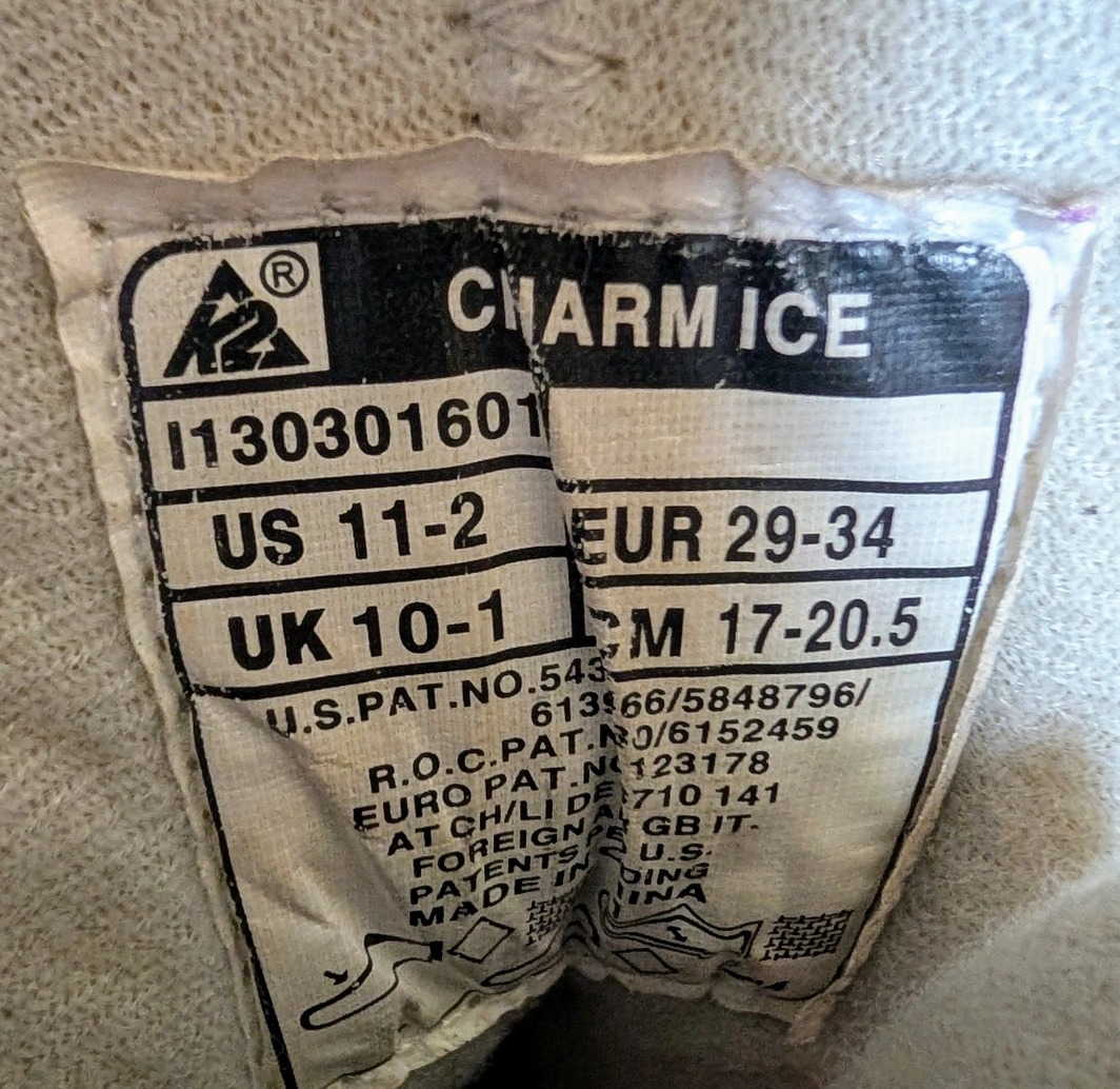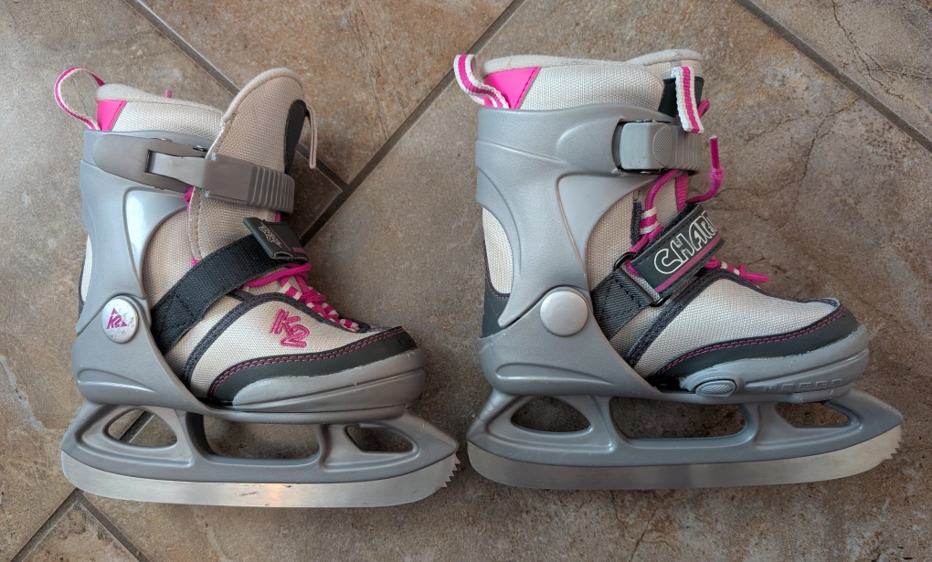 Girl's pink and grey K2 Charm adjustable ice skates will grow with your child. Fits sizes toddler 11 to child size 2. In excellent condition.