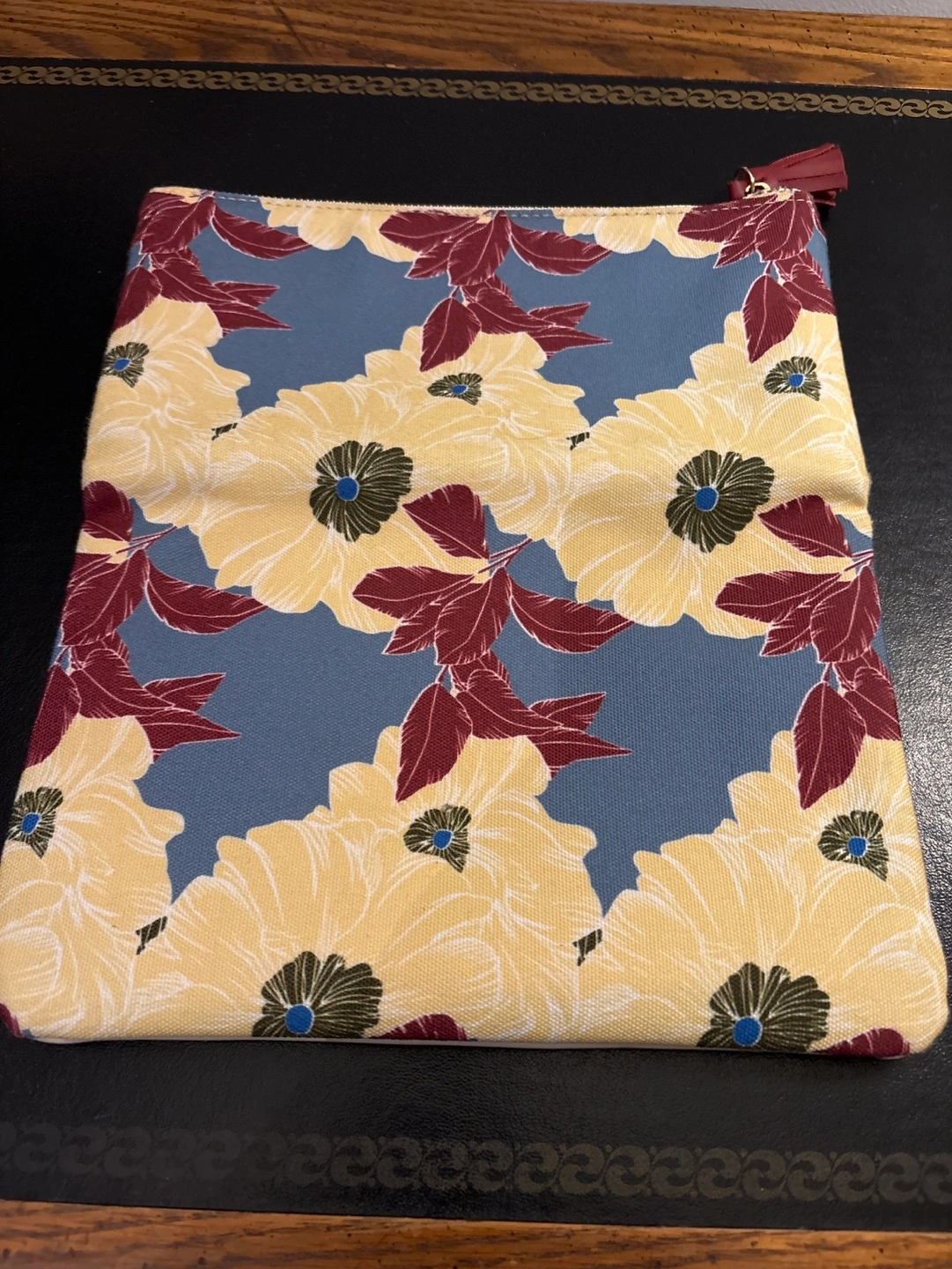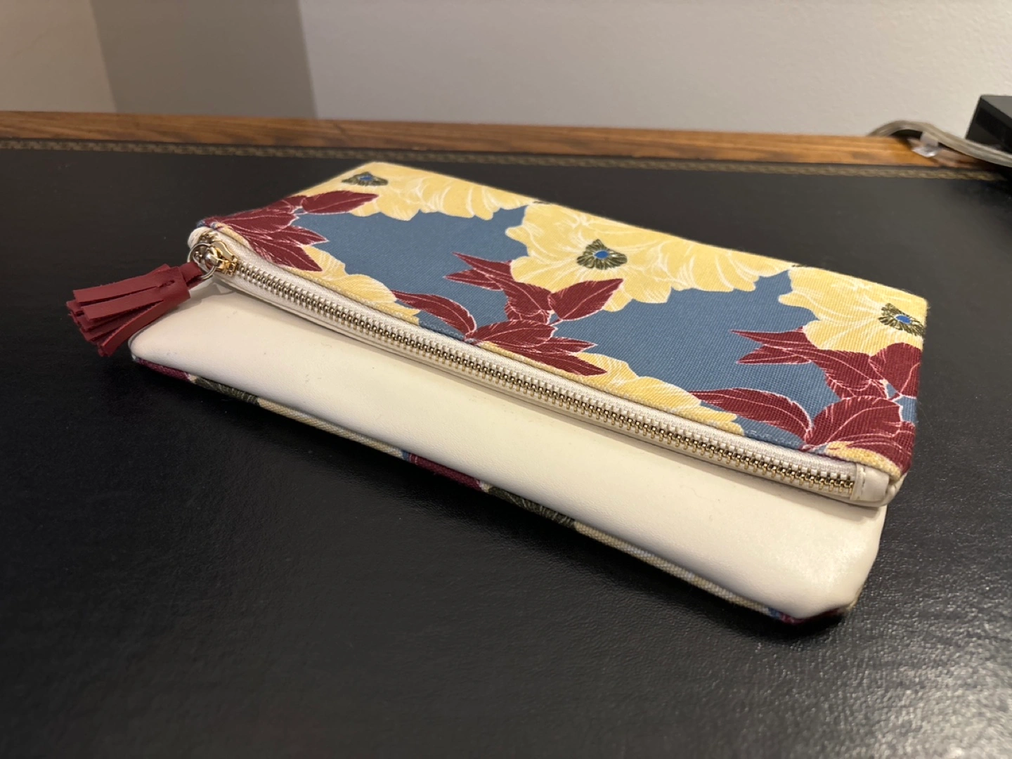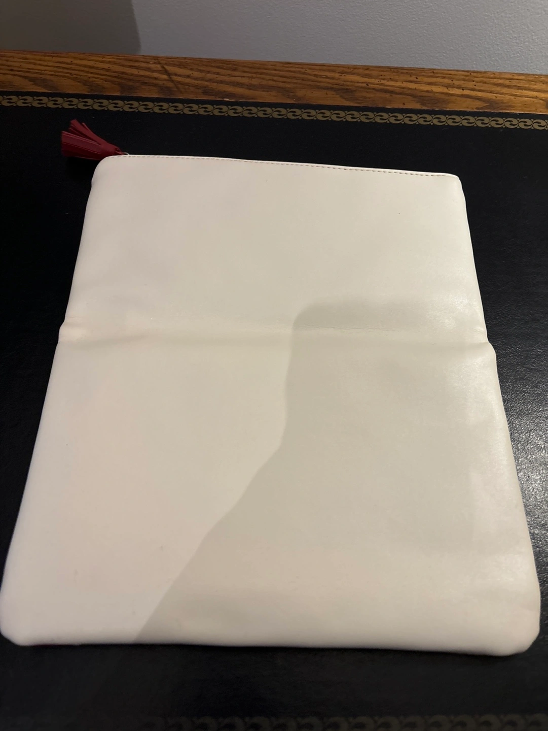 New without tags Anthropologie Rachel Pally flower print and leather fold over clutch. You can also use it as a tablet holder. Not a large one. When it is unfolded the clutch measures at 10” wide and 1 Ft in height. One side is leather and the other is a beautiful floral print. Gold zipper with burgundy leather tassel. Features an interior pocket that includes the floral print as its outline. Retails for over 40 before tax. Since there aren’t any tags but it is in perfect un-used condition, I have priced this item at 25. Firm. Cash only.