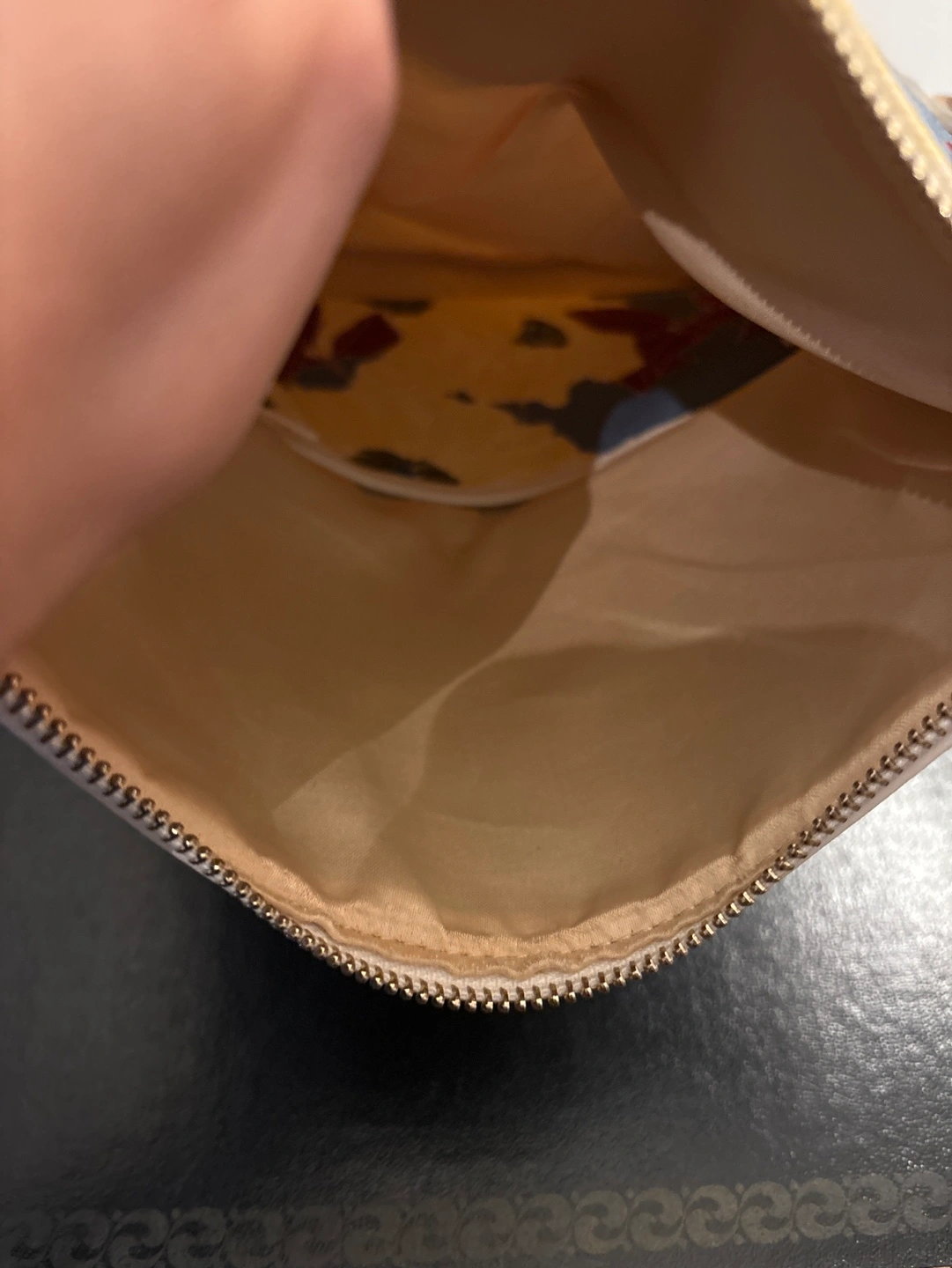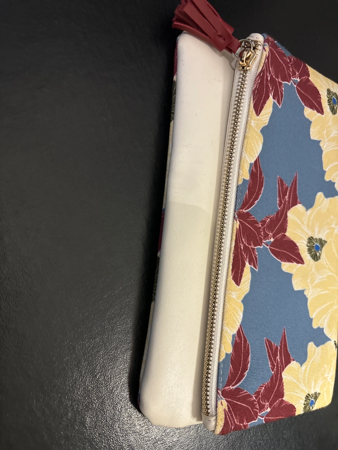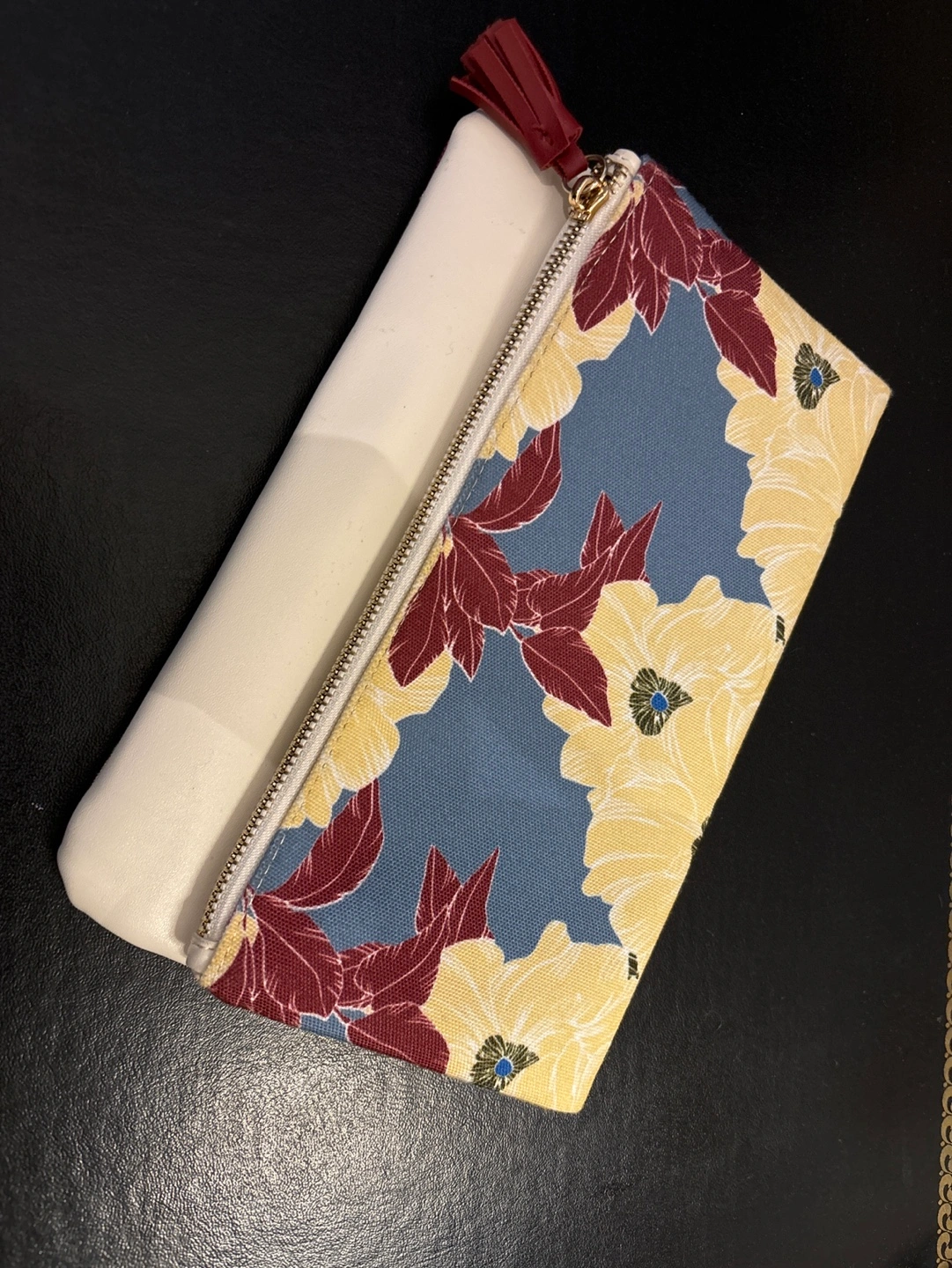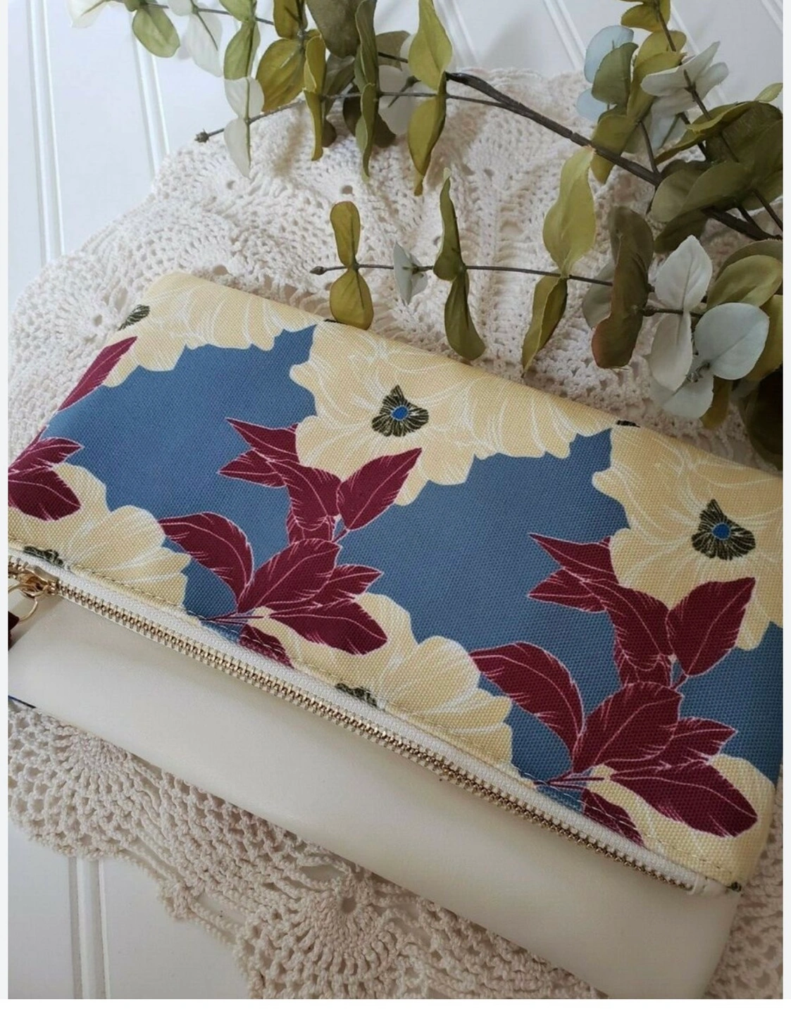 New without tags Anthropologie Rachel Pally flower print and leather fold over clutch. You can also use it as a tablet holder. Not a large one. When it is unfolded the clutch measures at 10” wide and 1 Ft in height. One side is leather and the other is a beautiful floral print. Gold zipper with burgundy leather tassel. Features an interior pocket that includes the floral print as its outline. Retails for over 40 before tax. Since there aren’t any tags but it is in perfect un-used condition, I have priced this item at 25. Firm. Cash only.