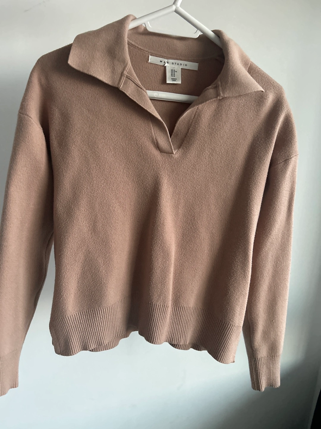 354Selling a beige long sleeve, collared sweater. Sweater is thick and warm. 50% rayon/viscose, 30% polyester, 20% nylon Mint condition, no stains or damages.